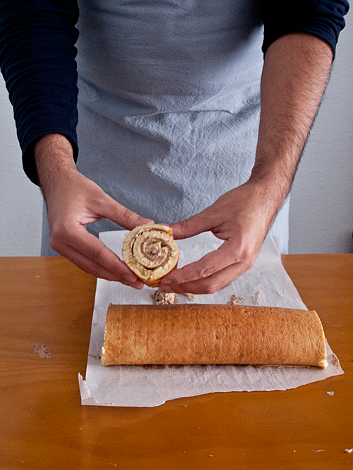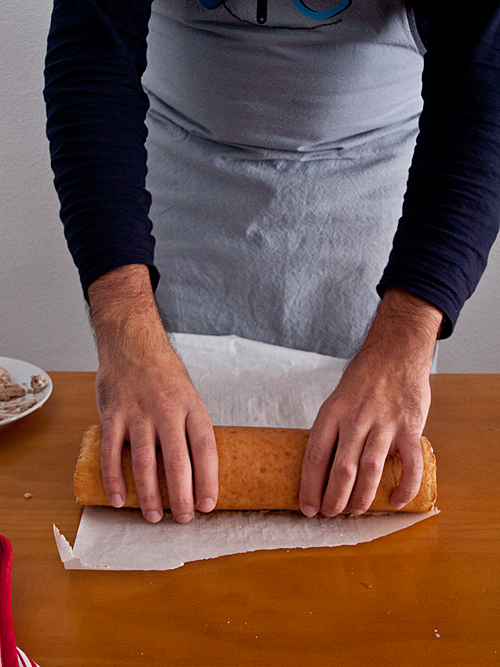 - Cubrimos el bizcocho con papel sulfurizado y lo enrollamos sobre sí mismo para que vaya cogiendo forma. Lo dejamos 10 minutos sin tocar, tapado con un paño, para que no se seque en exceso.