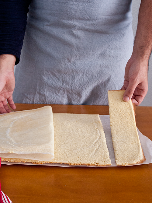 - Horneamos durante 10 minutos o hasta que la superficie empiece a dorarse. Sacamos y dejamos enfriar cinco minutos. Cortaremos una franja de cinco centímetros de ancho del lado más largo del bizcocho.