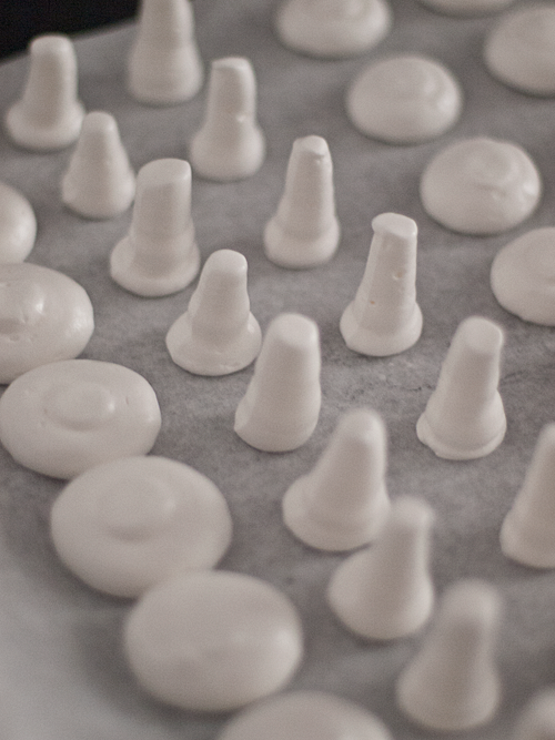 - Pasamos el merengue a una manga pastelera y sobre la bandeja del horno cubierta con papel sulfurizado vamos haciendo los champiñones: los rabos, presionando ligeramente y subiendo la manga hacia arriba; y las copas, colocando la manga recta y presionando para que se vayan formando las copas.