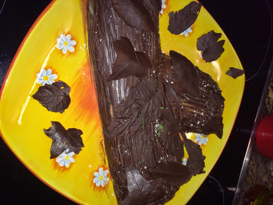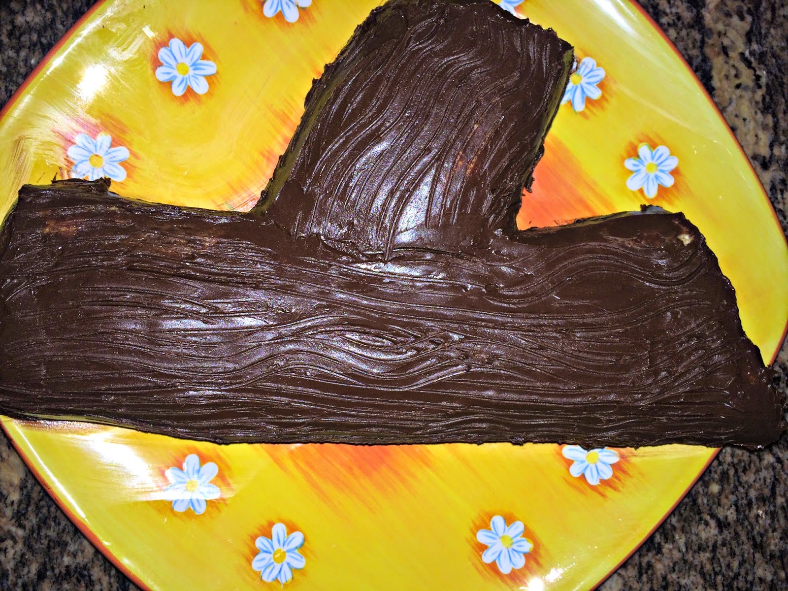 Lo pegamos al tronco y lo untamos todo de chocolate con una espátula. Si no tenemos espátula nos ayudamos de un cuchillo de mantequilla. Repartimos bien el chocolate por todo el tronco, y con un tenedor vamos a simular la corteza pasándolo por la superficie.