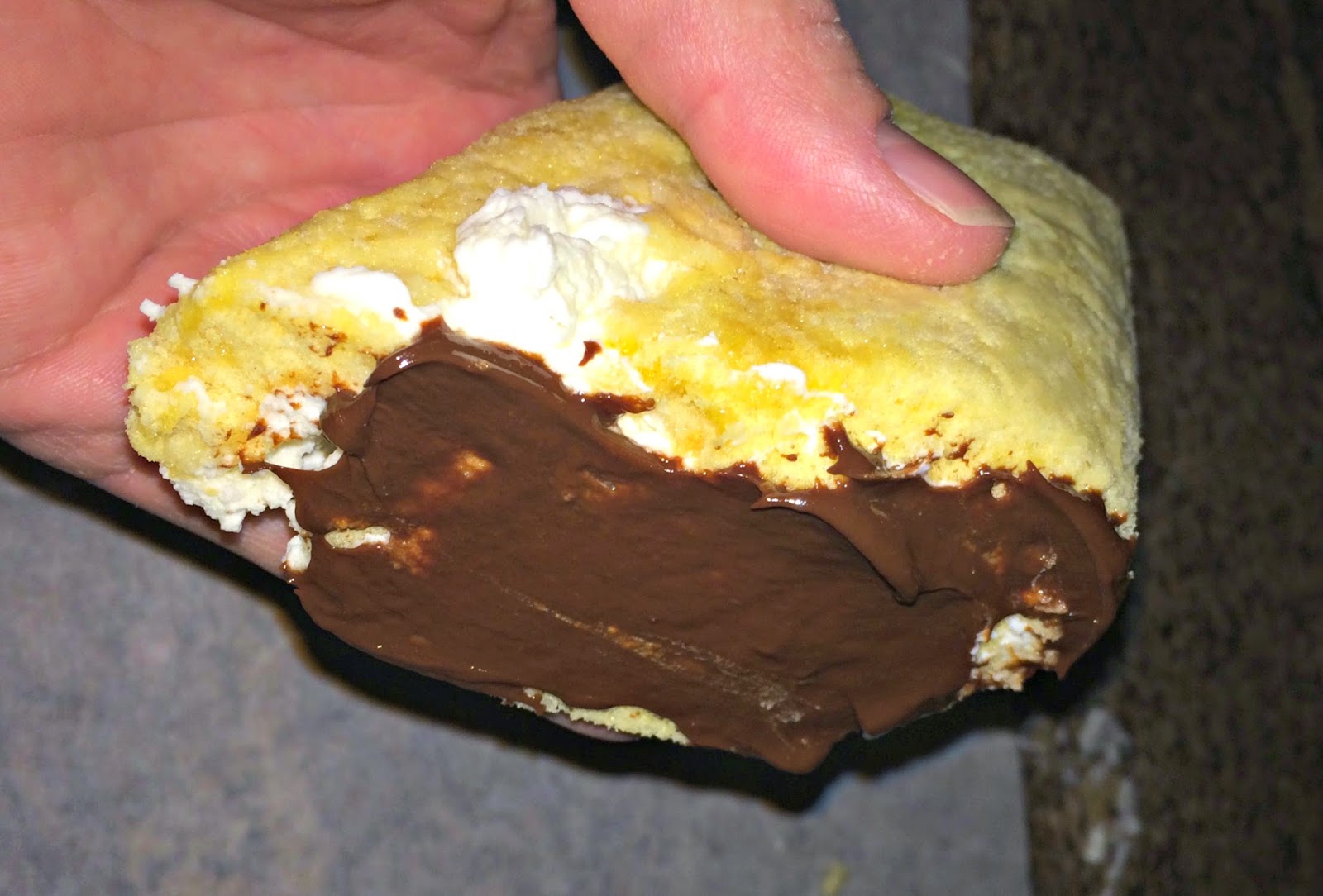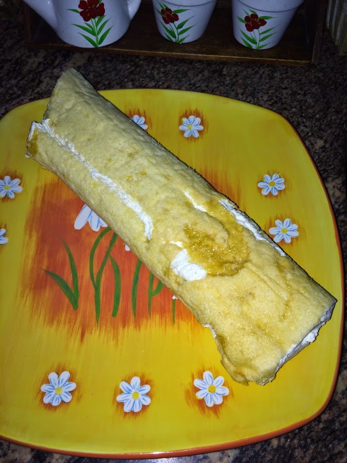 Mientras se templa el chocolate vamos montando la nata (crema de leche), extendemos la plancha de bizcocho, ponemos la nata (crema de leche), la extendemos y enrollamos el bizcocho dando la forma de brazo de gitano.