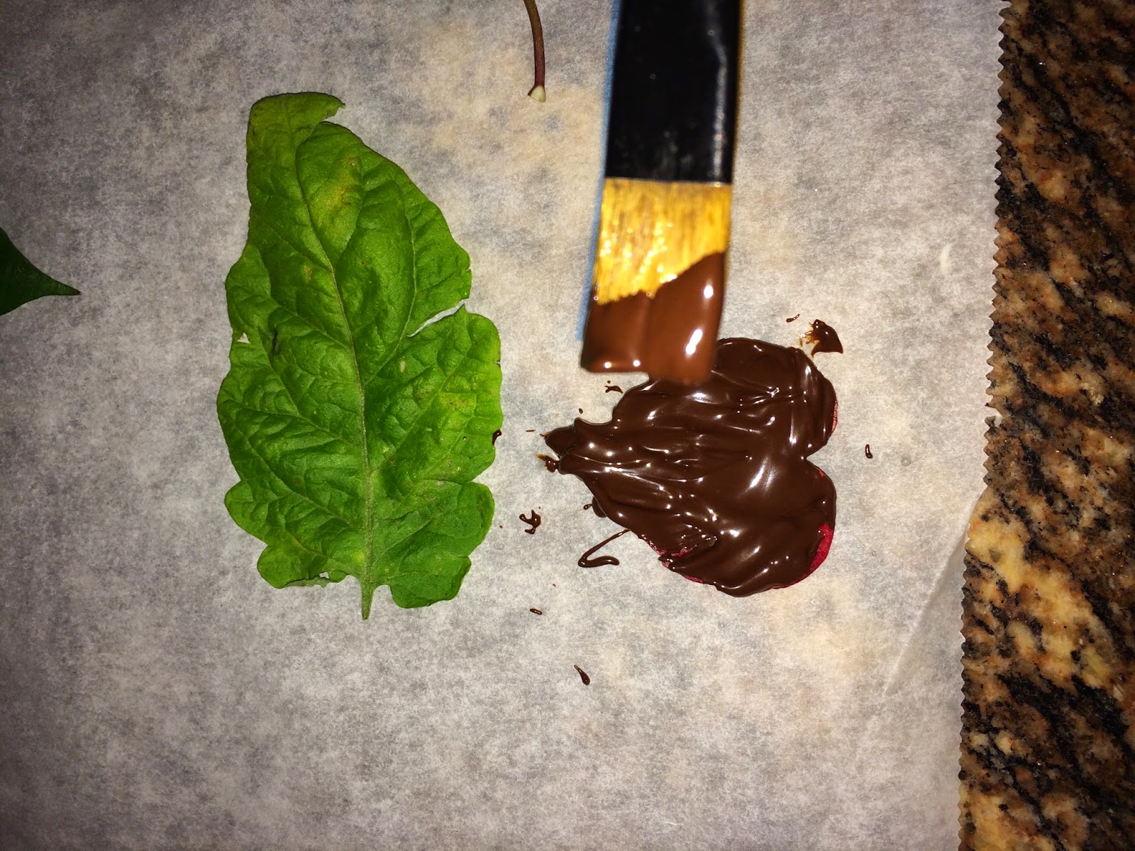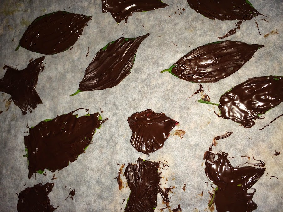 Una vez tengamos el chocolate derretido, con ayuda de un pincel vamos cubriendo todas las hojas con una buena capa de chocolate, y las dejamos enfriar en la nevera para que el chocolate coja cuerpo.