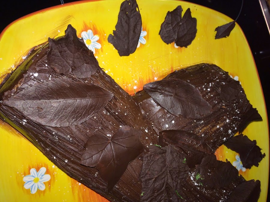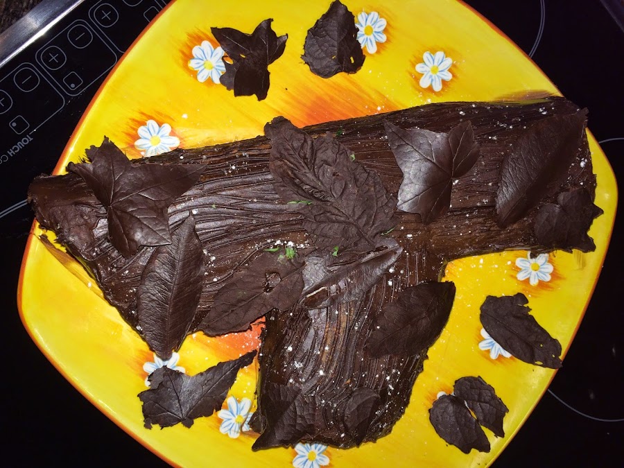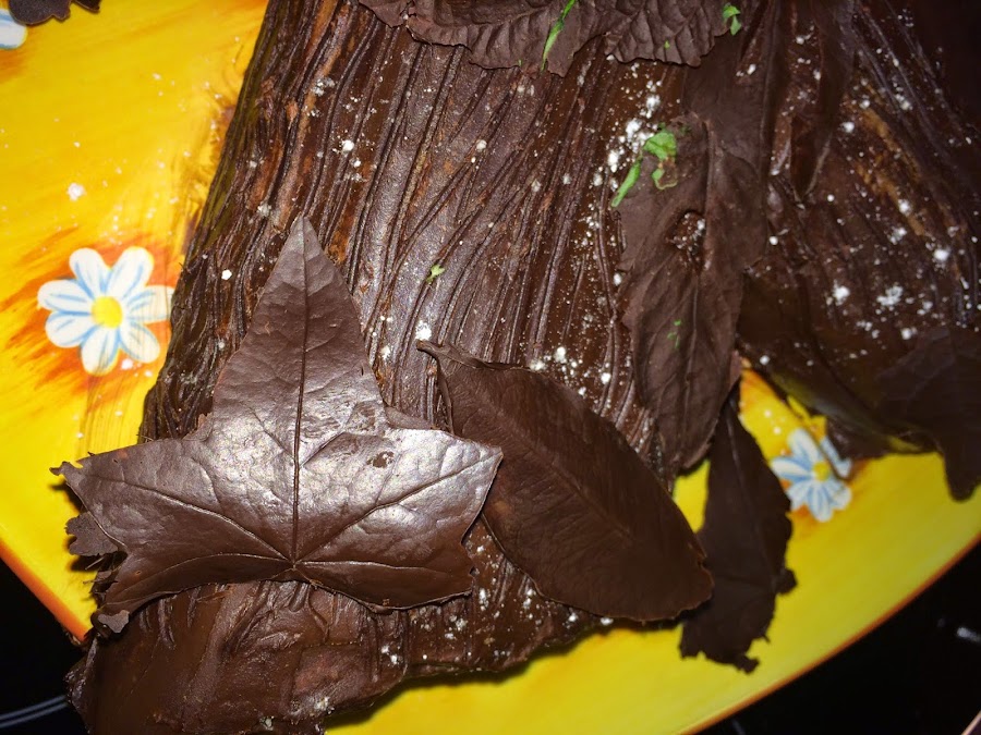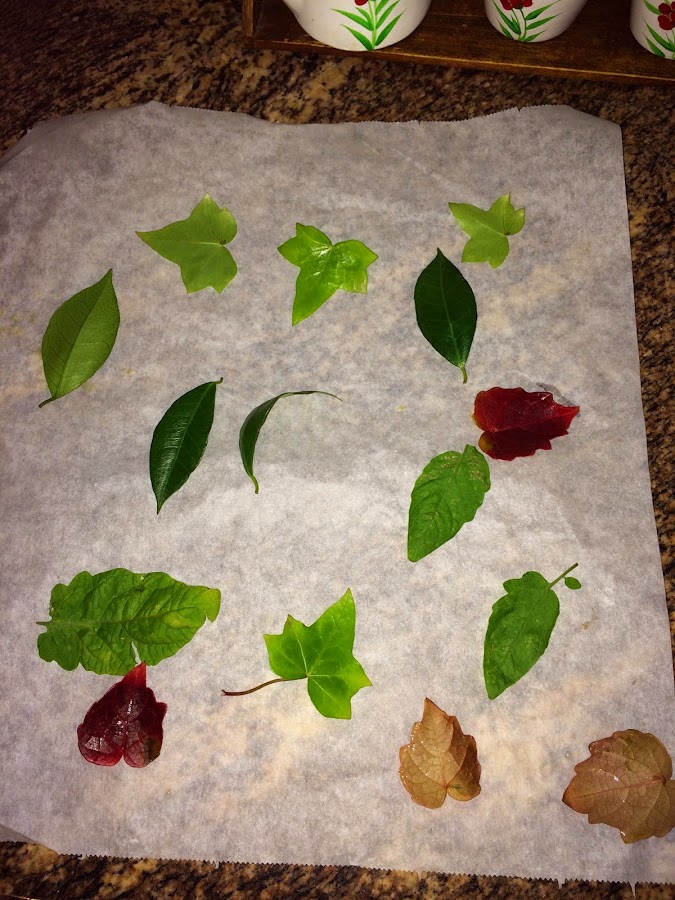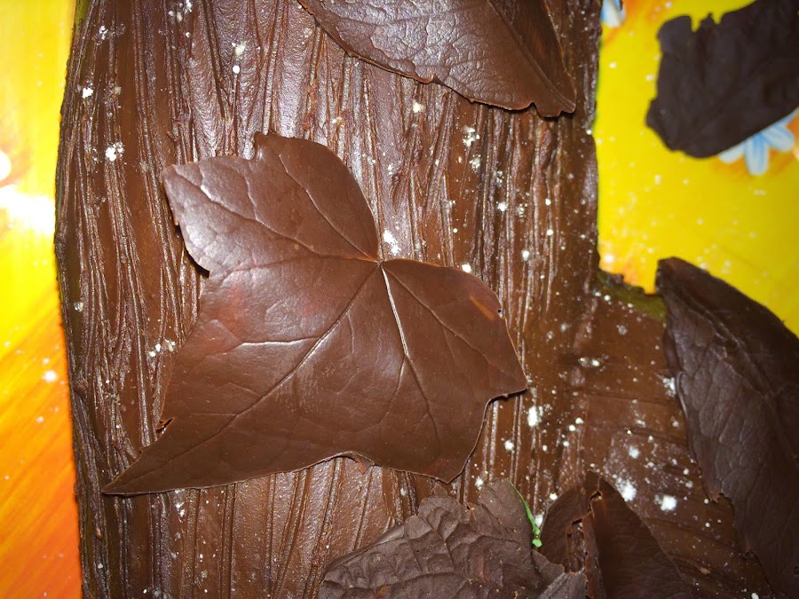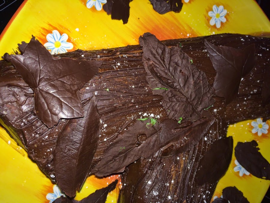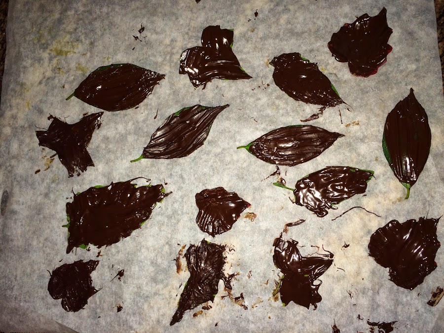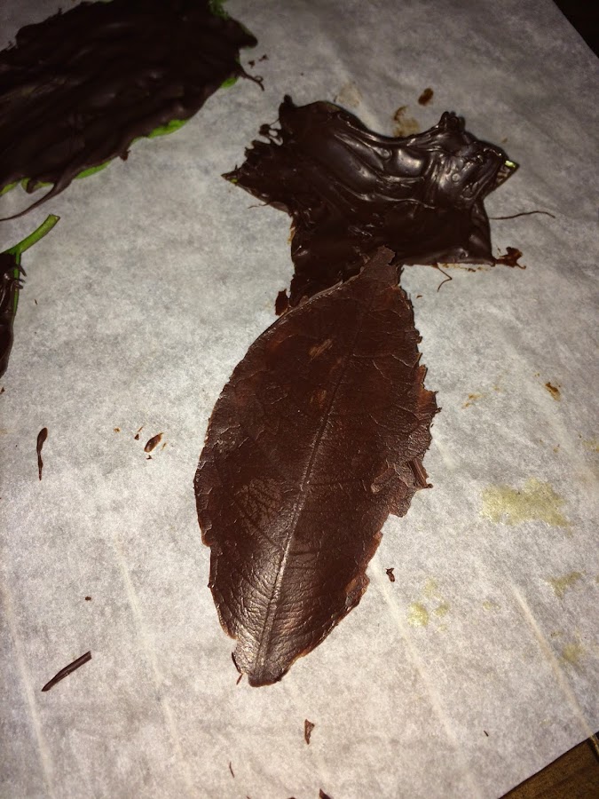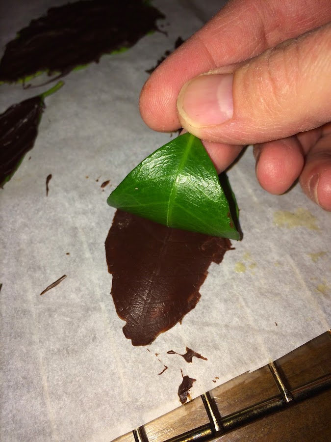 Y la segunda y más llamativa es decorarlo con hojas de chocolate. Para hacerlas cogeremos hojas pequeñas del jardín, las lavamos y la secamos con papel de cocina.
