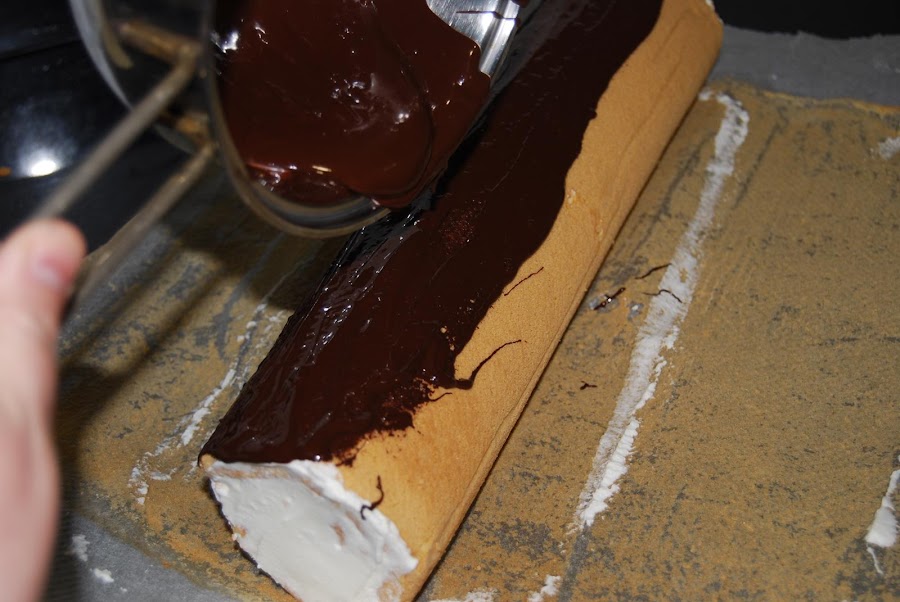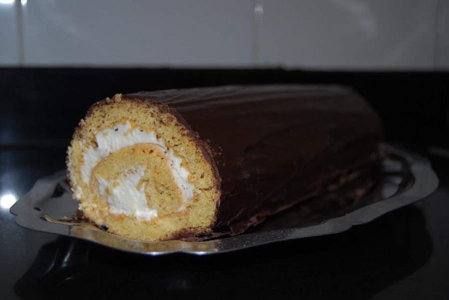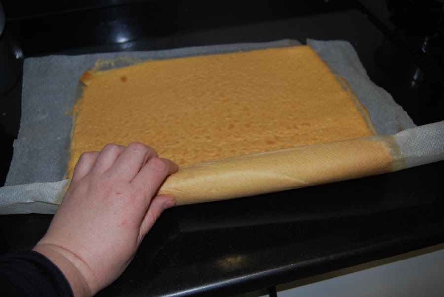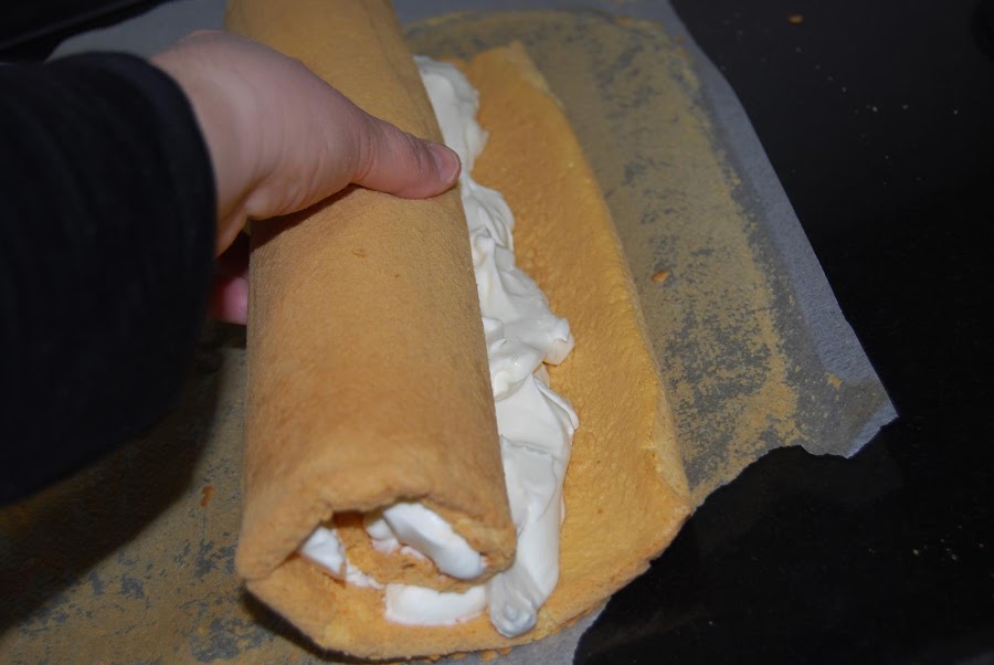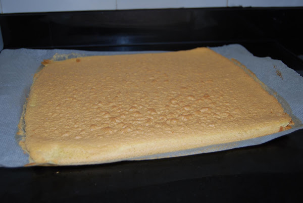 Montar la nata (crema de leche) en el recipiente que haya estado 15 minutos en el congelador y la nata (crema de leche) que este fría de la nevera.Desenrollar y despegar el papel.Ir rellenando con la nata montada (crema de leche) e ir rellenando y enrollando hasta el final.