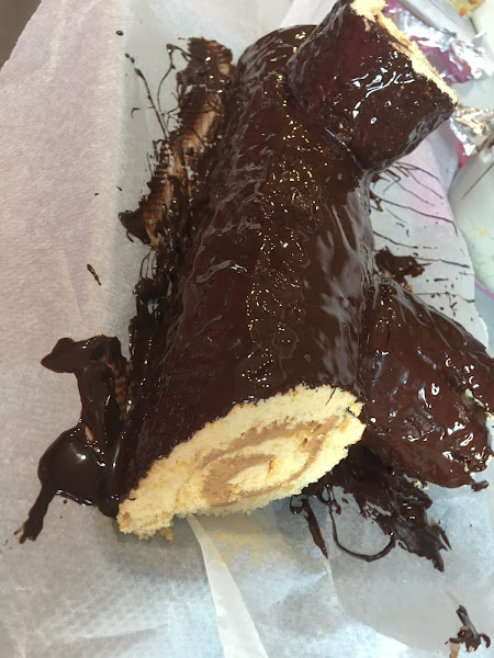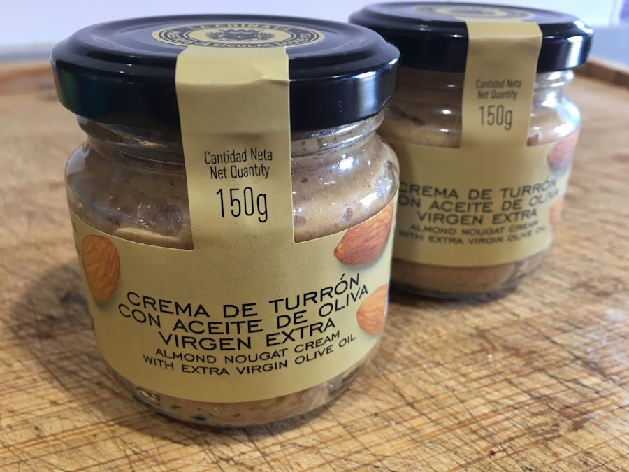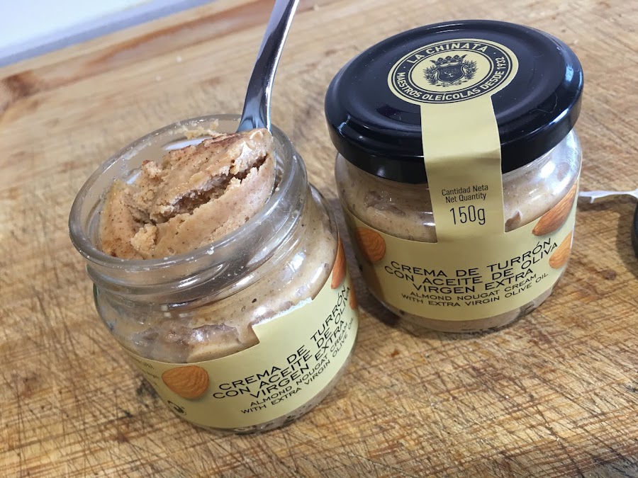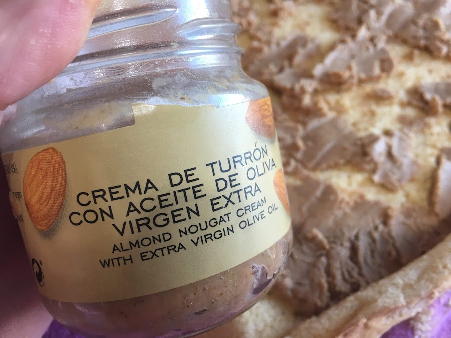9. Para el relleno he usado una crema de turrón que me encanta de La Chinata , hecha a base de turrón de Jijona, aceite de oliva virgen extra, limón y canela, os aseguro que está espectacular. Untamos la crema de turrón sobre la plancha de bizcocho que tenemos enrollada. Volvemos a enrollar de nuevo sobre si mismo.