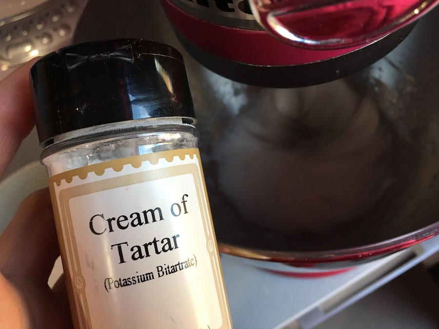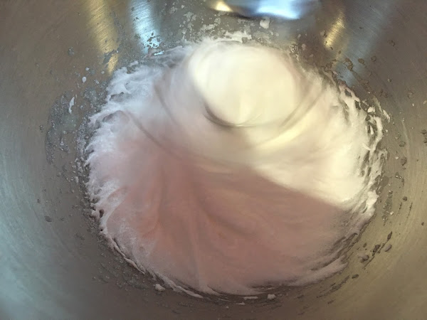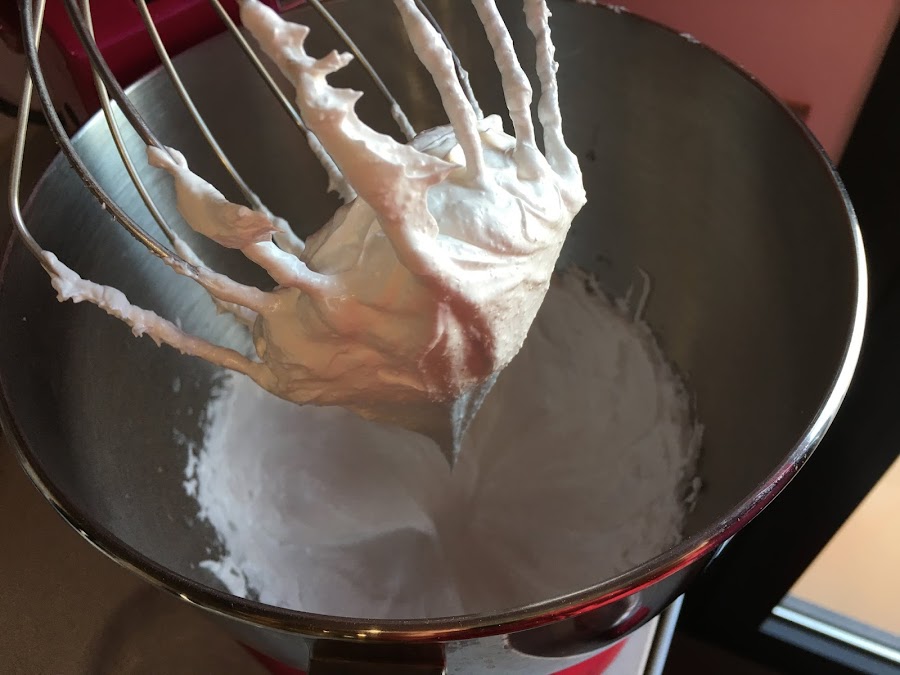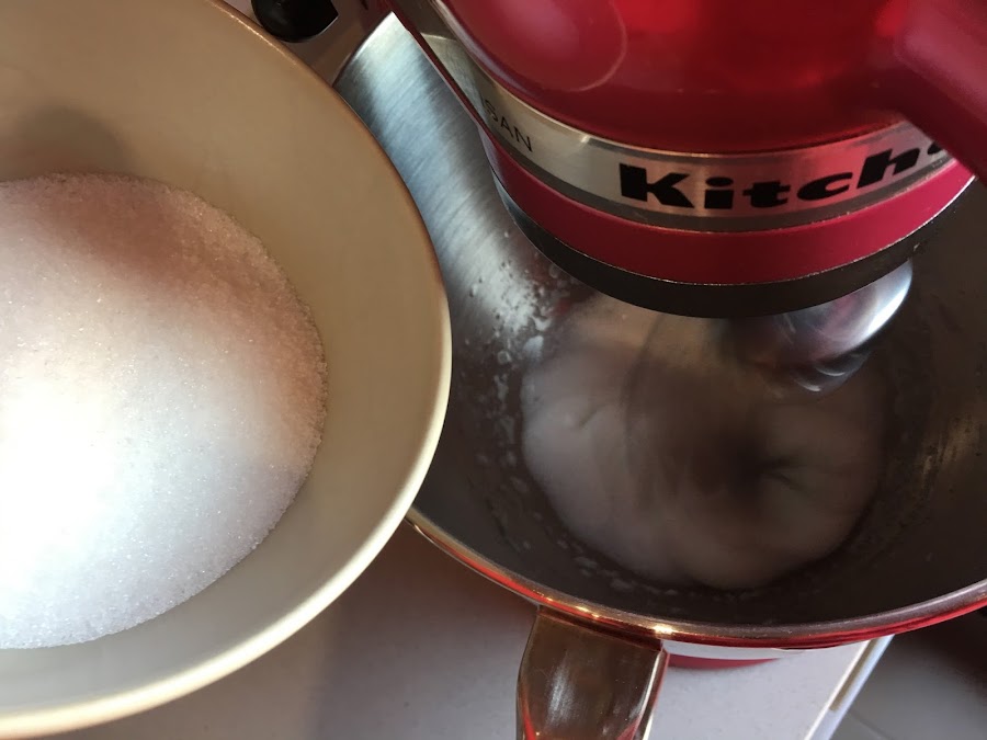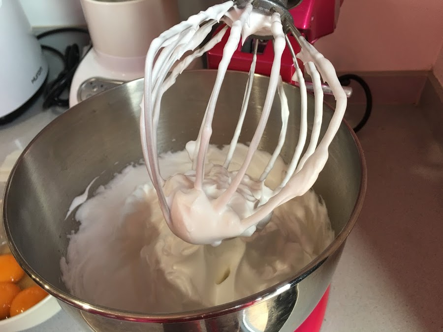 Precalentamos el horno a 70ºC. Ponemos una clara en el bol de la KA con una pizca de sal y de cremor tártaro. Batimos enérgicamente hasta que esté semimonatada. Añadimos el azúcar en forma de lluvia poco a poco sin dejar de batir, seguimos batiendo 4 minutos más hasta que se forme nuestro merengue.