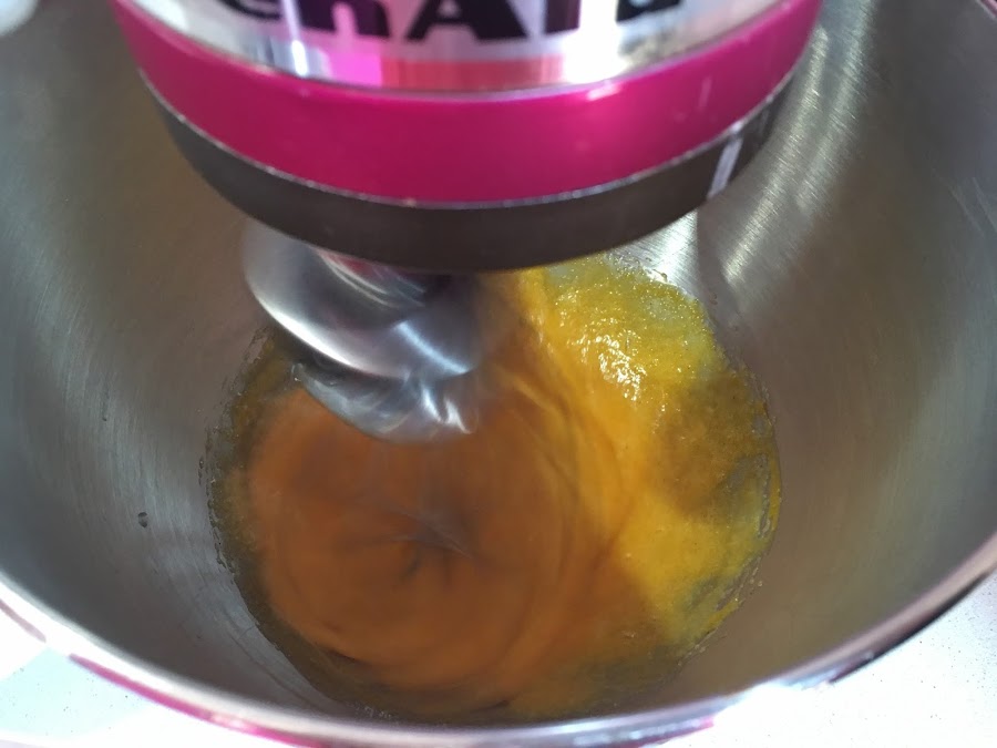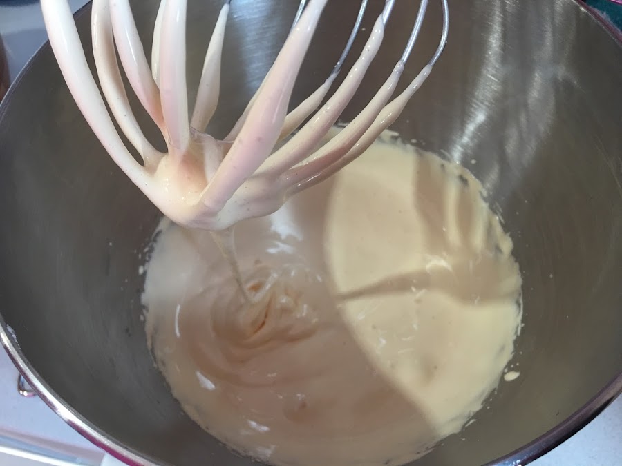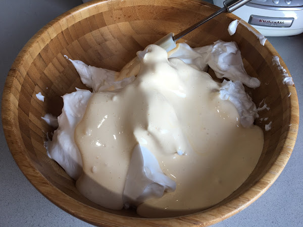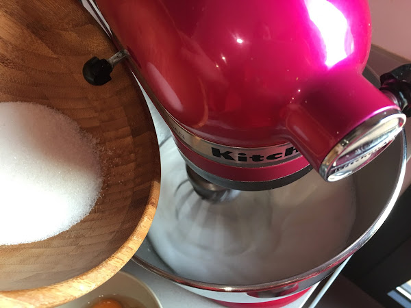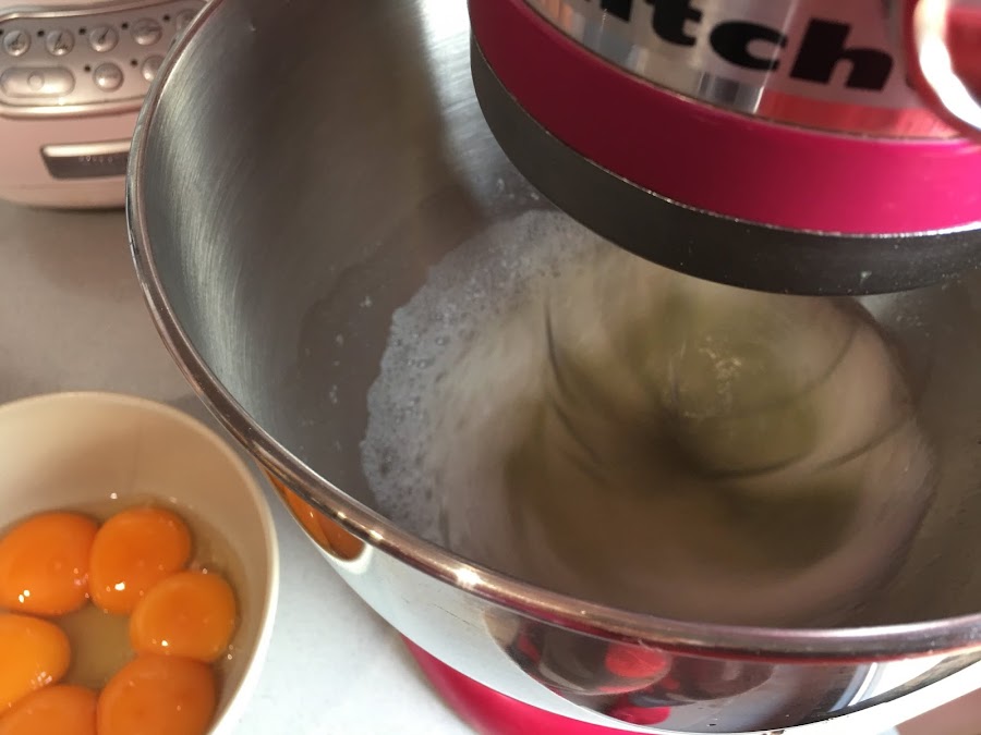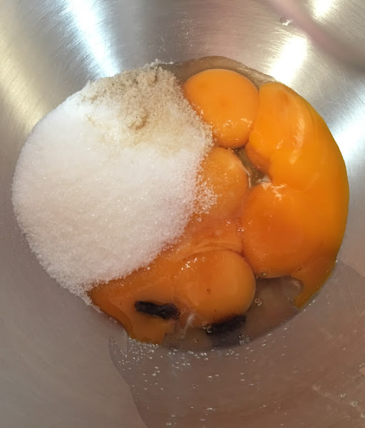 6. En el bol de la KA ponemos las yemas con los 60g de azúcar y la cucharadita de vainilla en pasta. Batimos a velocidad máxima hasta crear una crema blanquecina. Las ponemos en el mismo bol donde hemos dejado las claras montadas y con ayuda de una espátula mezclamos con movimientos envolventes.