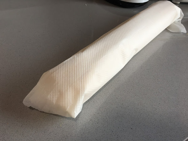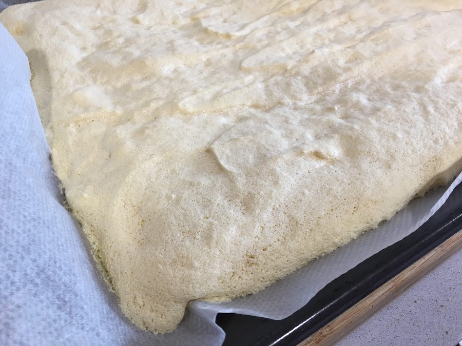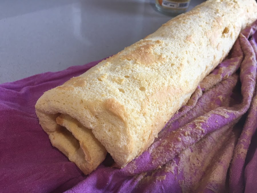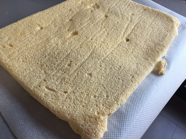 8. Dejamos enfriar 10 minutos a temperatura ambiente e inmediatamente le damos la vuelta sobre un papel de horno o un paño de algodón húmedo, a mi me funcionó mejor la segunda opción, con el papel de horno tiende a pegarse más. Enrollamos sobre si mismo y dejamos que enfríe por completo antes de rellenar.