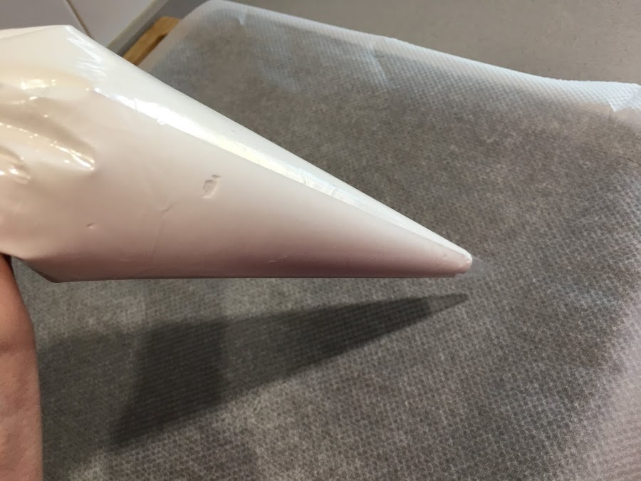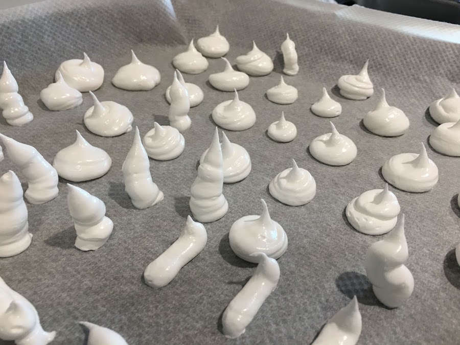 2. Ponemos el merengue en una manga pastelera, cortamos la punta y preparamos los pies y cabezas de los champiñones sobre una bandeja de horno cubierta de papel de horno. Es importante que los pies sean hacia arriba, os será mucho más sencillo para hacer el montaje de cada champiñón.