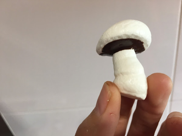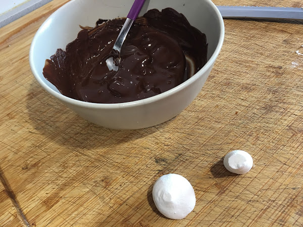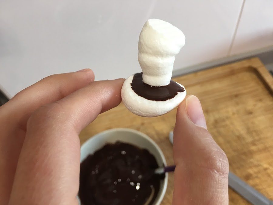 4. Cuando hayan enfriado por completo podemos prepararlos. Fundimos un poquito de chocolate negro y pegamos los pies con las copas, dejamos que sequen y ya tendremos nuestros champis listo para el día siguiente. Aguantan prácticamente un mes si los conservamos en una lata hermética.