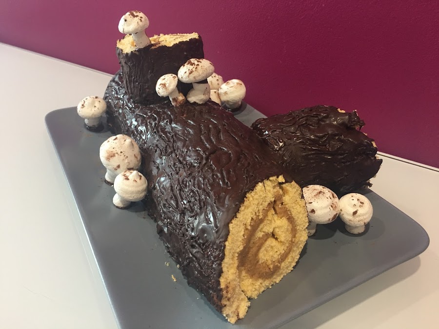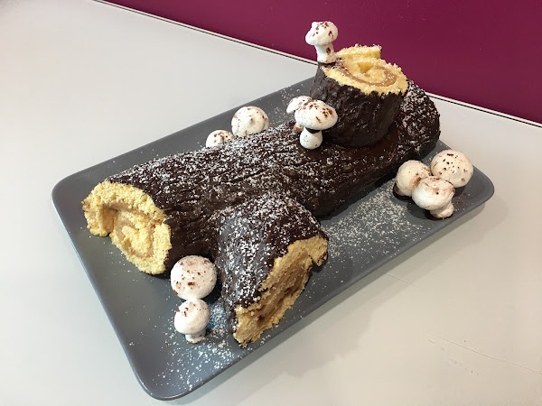 12. Una vez cubierto por completo marcamos toda la superficie con un tenedor, para similar la textura de un tronco natural. Retiramos el papel que hay debajo antes de que el chocolate solidifique y colocamos los champiñones que hemos preparado por el tronco de Navidad. Poner un poco de chocolate derretido en el pie de cada champiñón para que quede pegado al plato. Espolvoreamos el azúcar glacé por encima simulando la nieve.