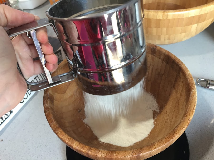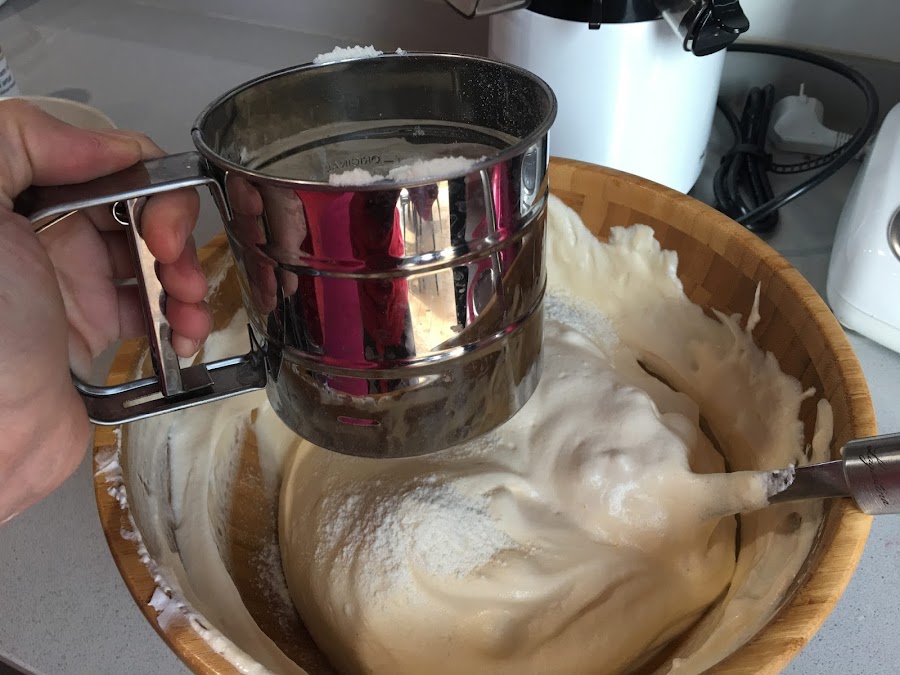 7. Añadimos los 120g de harina tamizada poco a poco a la mezcla, y los incorporamos de la misma forma con la espátula y movimientos envolventes. Cubrimos la bandeja de horno con papel de hornear y vertemos la masa sobre él, alisamos un poco la superficie y horneamos 14 minutos a 170ºC.