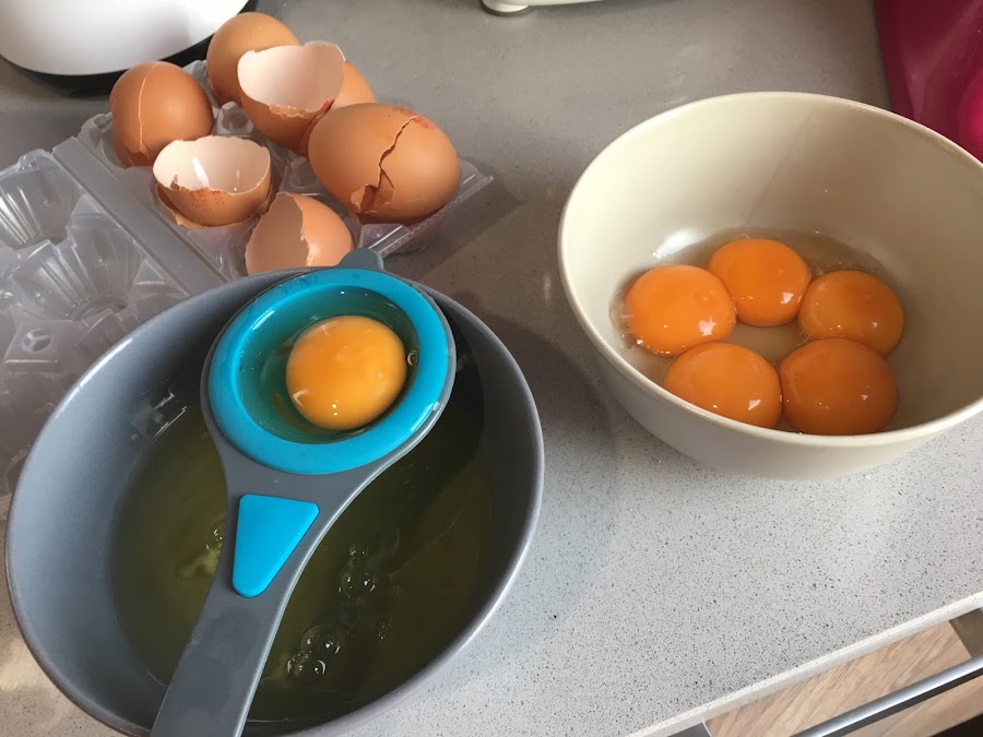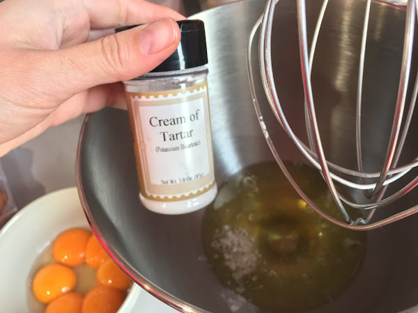5. Precalentamos el horno a 170ºC. Para el bizcocho genovés separamos las yemas de las claras. Ponemos las cinco claras en un bol junto con la pizca de sal y el cremor tártaro. Batimos hasta que estén semimontadas y añadimos los 60g de azúcar poco a poco sin dejar de batir. Las reservamos en un bol.