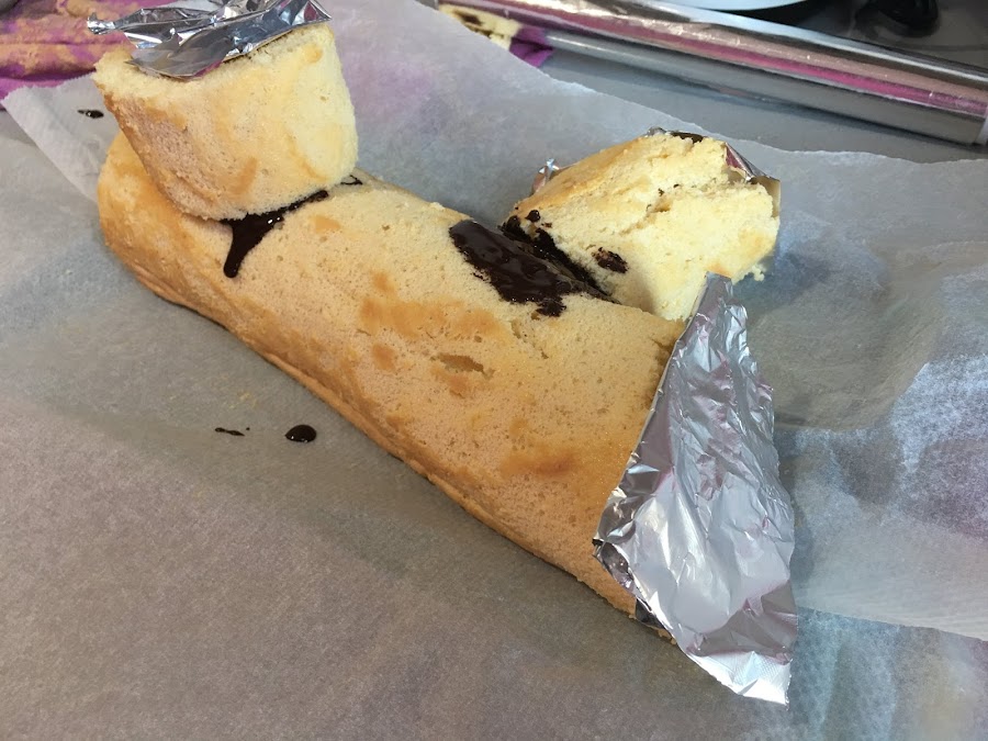 10. Para el que el bizcocho deje de parecerse a un brazo de gitano y se convierta en un tronco de Navidad debemos cortarle los dos extremos y colocarlos como aparece en la foto, uno en la parte lateral y otro en la superior. Un corte debe ser totalmente recto y el otro cortado al biés, para que la parte frontal tenga un corte más inclinado y bonito. Para que se aguanten sobre el tronco les he puesto un palito de pincho atravesándolo y he cubierto con papel de aluminio los extremos para no mancharlo al cubrirlo. Si os fijáis en la foto veréis que el papel de horno que esta debajo del tronco de Navidad esta partido por la mitad, es un truquillo para que resulte mucho más sencillo retirarlo una vez tengamos el tronco bañado, así que el plato que hay debajo debe ser en el que queréis emplatarlo.