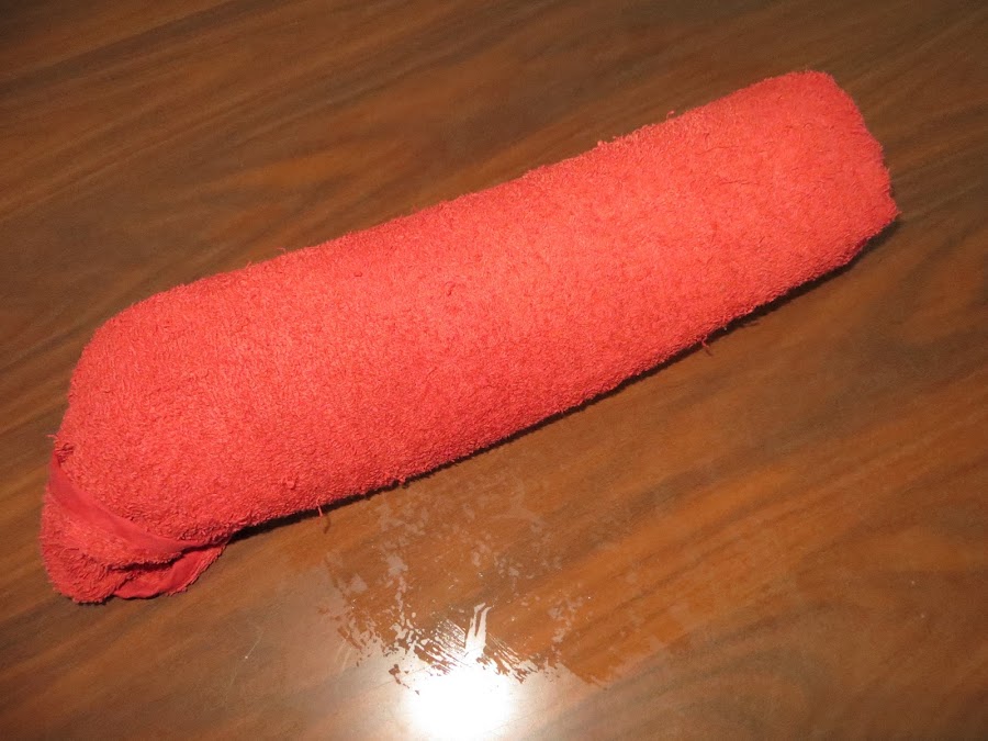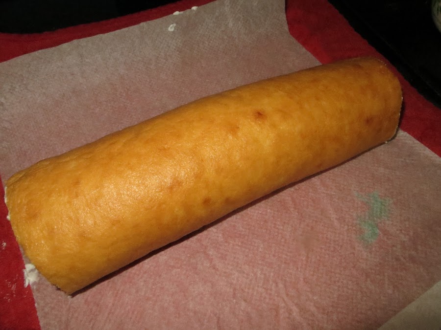 Sacamos la bandeja, colocamos otro papel de horno y un trapo de cocina encima del bizcocho y le damos la vuelta, ahora cuando todavía está caliente enrollamos y lo dejamos envuelto en trapo de cocina.