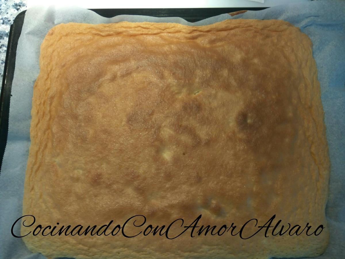 Introducimos al horno precalentado a 180 grados, durante 10 minutos. Pincharemos para saber si está, estará cuando salga limpio al pinchar. Lo sacamos del horno y le vamos enrollando, formando un rulo, es la forma que dará al Tronco. Y dejamos enfriar.