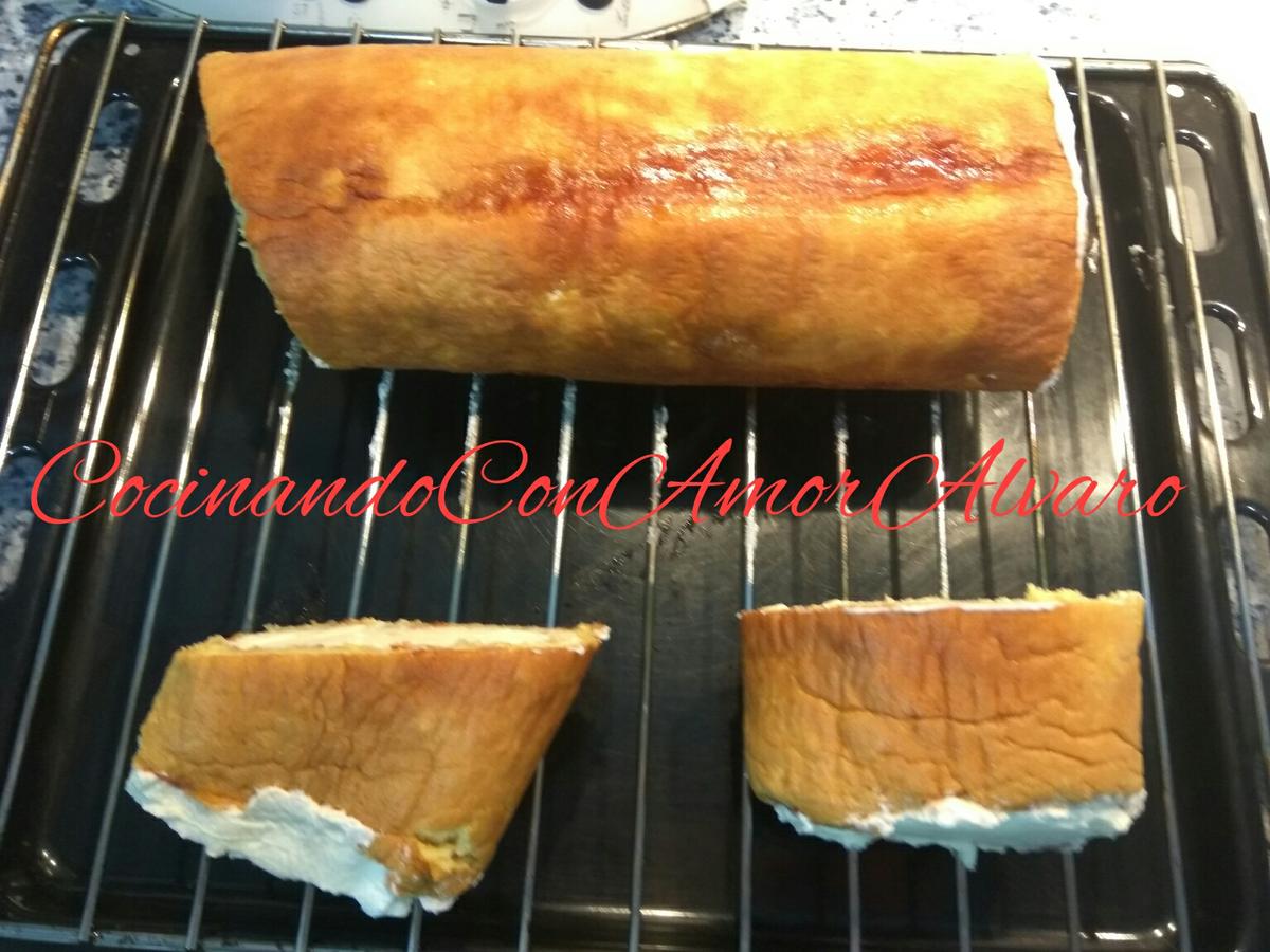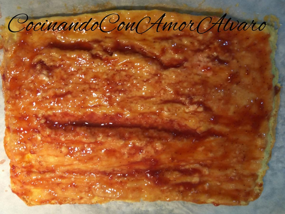 Desenrollamos el bizcocho, y la untamos el almíbar de mermelada de Fresa. Que quede bien impregnado.