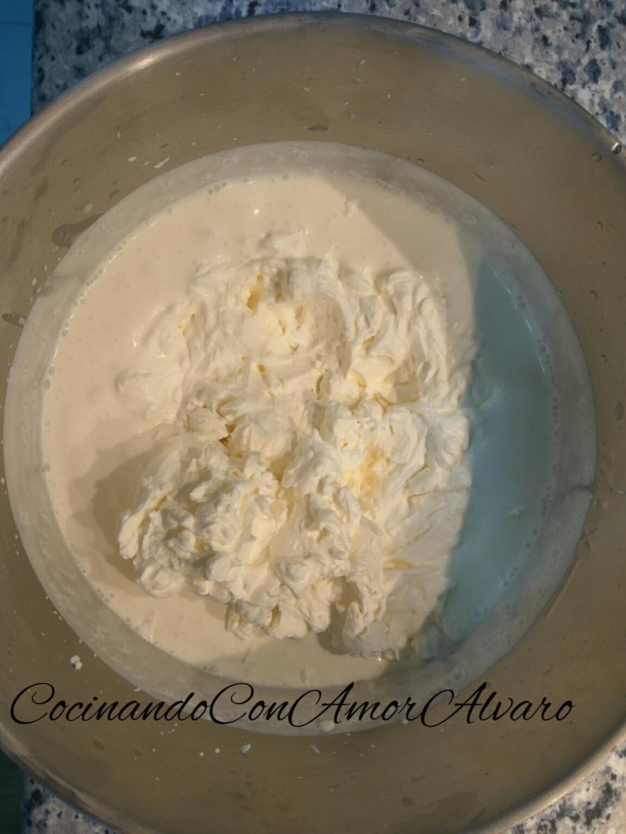 Ahora sacamos la nata (crema de leche) del frigorífico y vamos untado con la espátula, buena cantidad para quede jugoso por dentro.