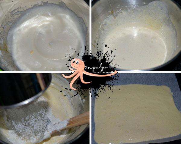 Estiramos el bizcocho sobre una hoja de papel de horno y horneamos de 10 a 15 min a 180ºC