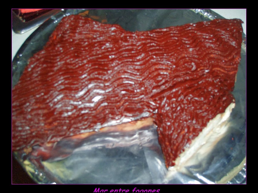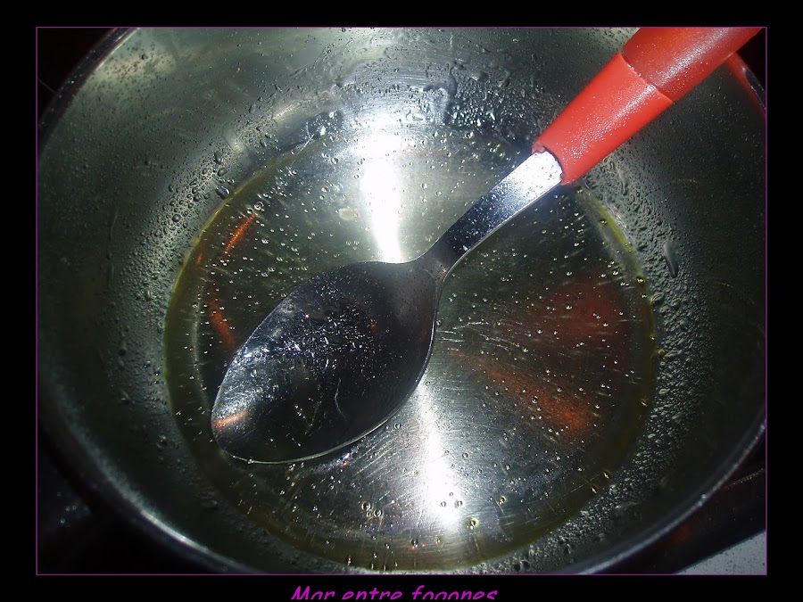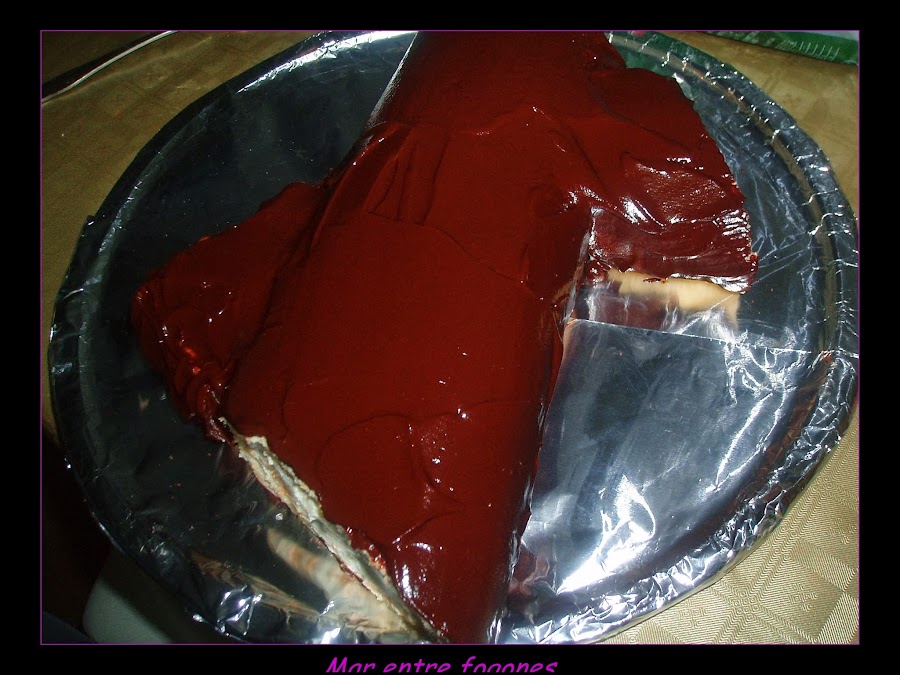 Retiramos del fuego la cacerola pero dejamos la fuente dentro del agua para que no se nos enfríe mucho la cobertura.
