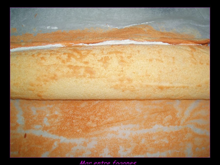 Ponemos una tira de turrón blando todo lo largo del bizcocho por donde vamos a empezar a enrollar.