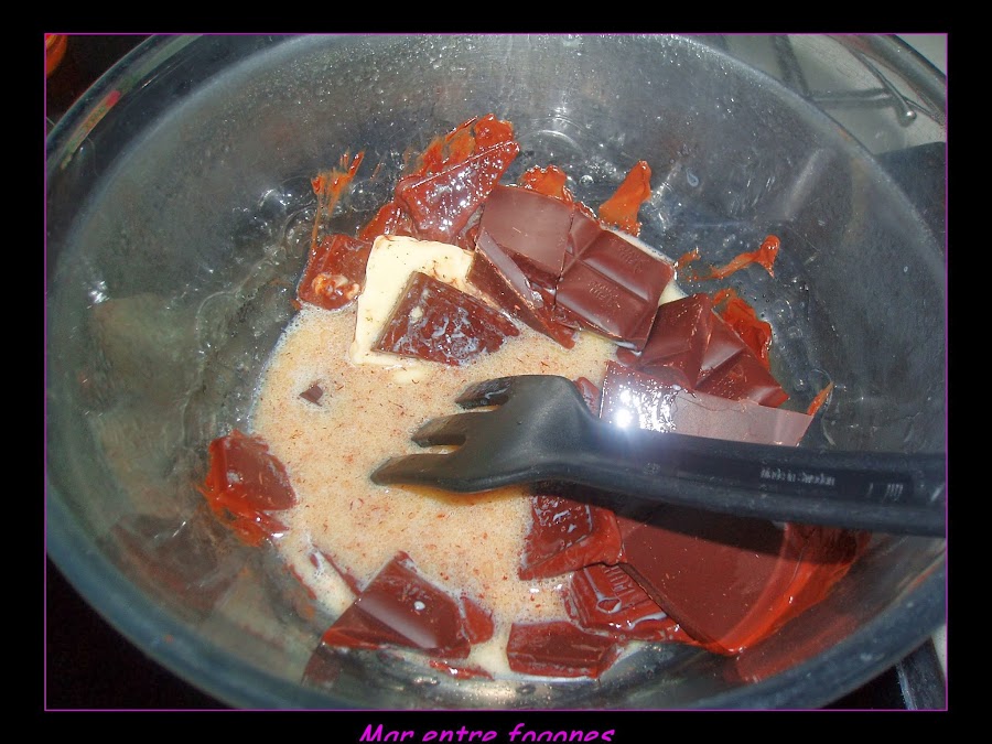 Mientras se calienta el agua ponemos en la fuente la leche, la mantequilla y el chocolate.