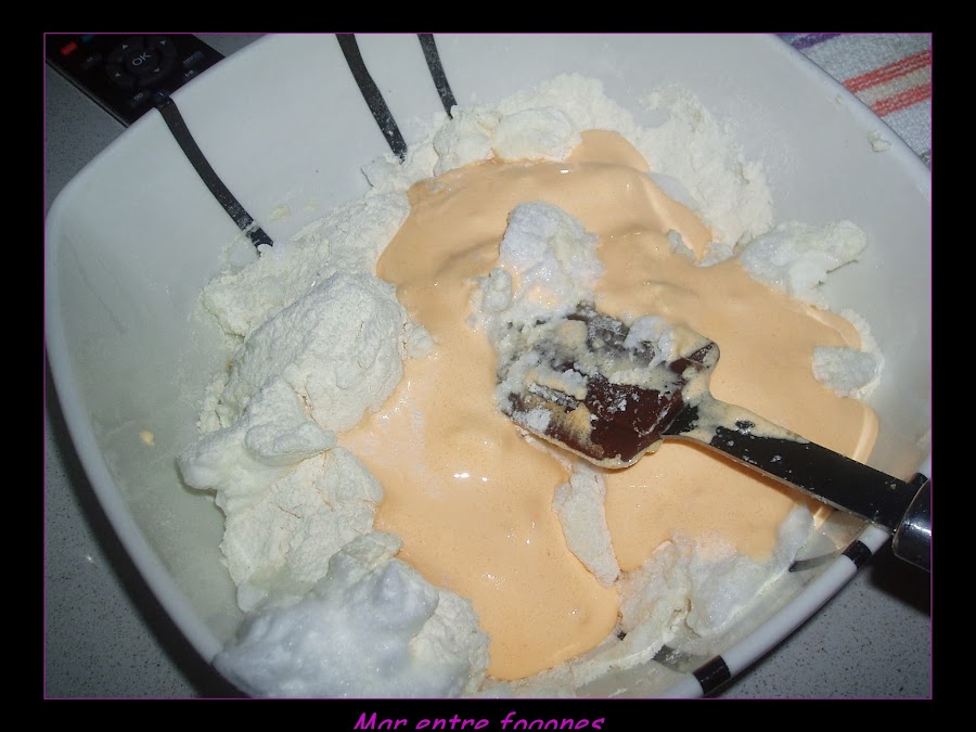 Añadimos la mezcla de azúcar y las yemas y volvemos a mover con movimientos envolventes.
