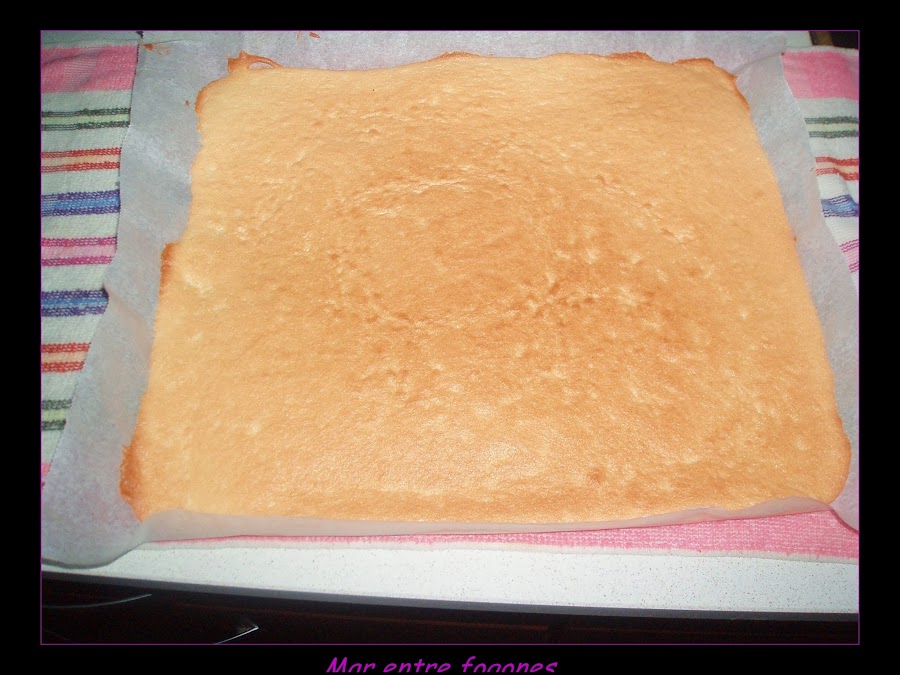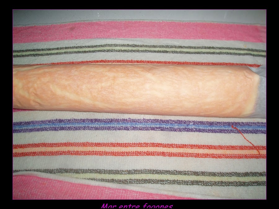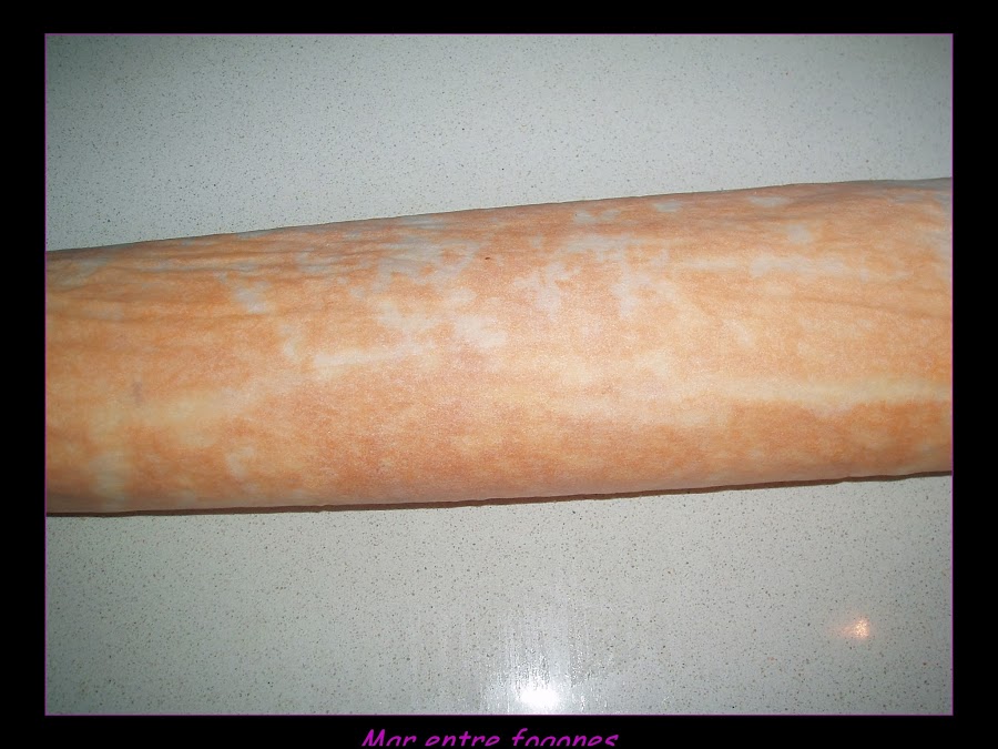 Enrollamos con el papel de horno puesto y cubrimos con un trapo húmedo 5 minutos.