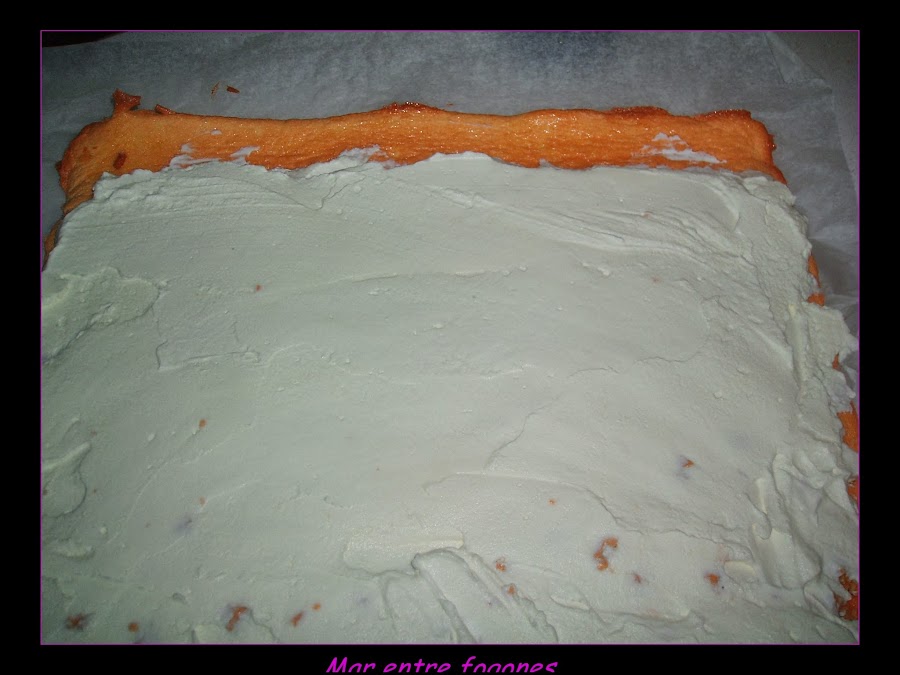 Ponemos la nata montada (crema de leche) por encima y alisamos con un cuchillo grande.