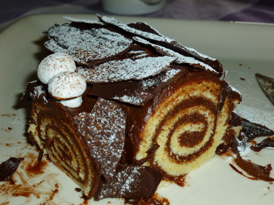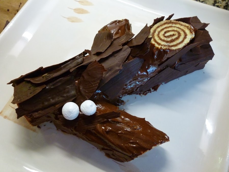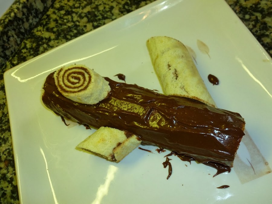Coger el rollo más gordo y cortarle los extremos, colocarlo en una fuente y cubrirlo con chocolate trufado (excepto los extremos).