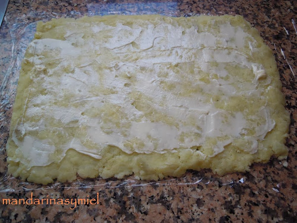Pon un film transparente en la encimera y coloca encima el puré de patatas, extiéndelo de forma rectangular por todo el film.