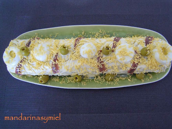 Este brazo lo puedes rellenar de lo que te apetezca, hay muchos ingredientes que le van bien, pepinillos, gambitas saladas peladas, pimientos del piquillo.....
