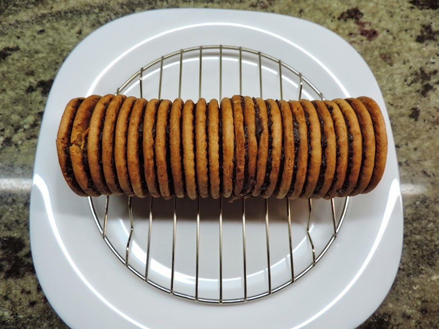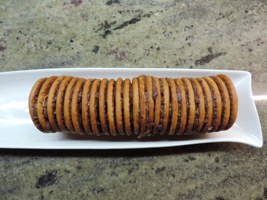Así hasta acabar con el paquete de galletas. Lo dejamos así y lo metemos un rato al frigorífico para que las galletas se queden más pegadas.