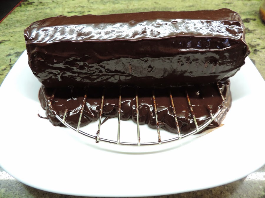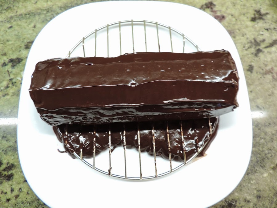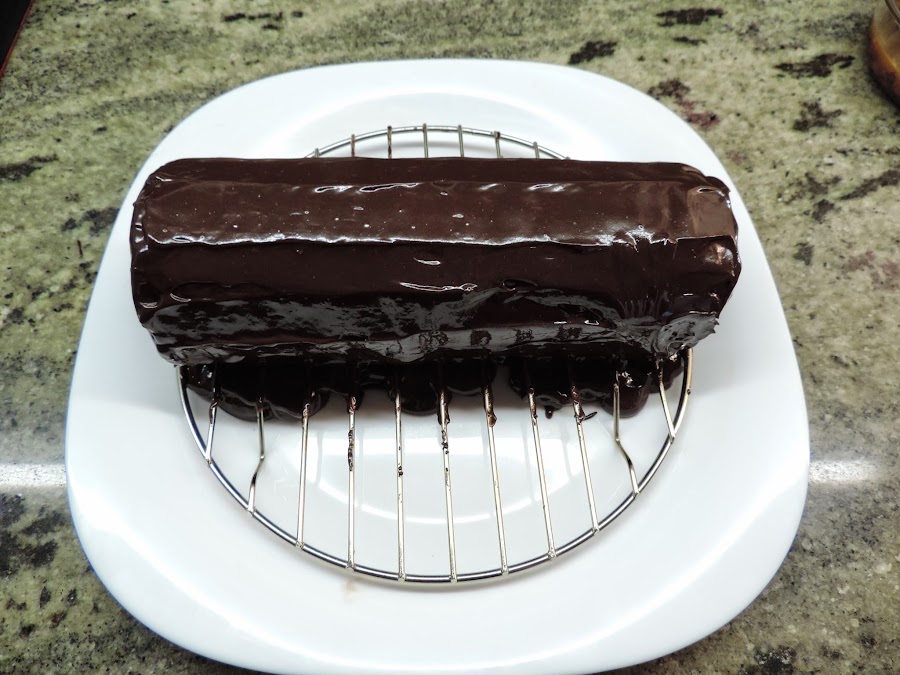 Lo sacamos del frigorífico y lo ponemos encima de una rejilla con un plato debajo para que caiga el chocolate sobrante.