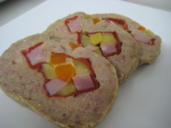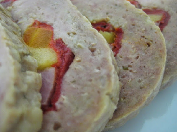 Preparación: En un bol mezclar las tres clases de carne picada con el huevo, el pan rallado, un poco de ajo en polvo, cebolla en polvo, nuez moscada y perejil picado, sal y pimienta. Amalgamar bien y dejar reposar en la nevera bien tapada media hora. Una vez pasado el tiempo de reposo (de esta forma la carne queda más aromática) poner la carne en papel de horno ligeramente engrasado, habiendo puesto éste sobre papel de aluminio, formar un rectángulo y colocar encima pimientos extendidos, luego bastones de zanahoria, de jamón cocido y de manzana. Enrollar apretando fuerte y ayudándonos con el papel de horno. Luego envolver bien fuerte en el papel de aluminio y poner en una bandeja de horno con un poco de aceite y un poco de fondo o caldo. Hornear a 180º C durante 22 minutos. Pasado este tiempo darle la vuelta al tronco y hornear otros 22 minutos. Una vez hecho retirar del horno, espera un poco y desenvolver. Entonces envolver con papel film y ponerlo a prensar para que quede bien unido. Una vez que esté frío ya se puede cortar y servir con la salsa. Para hacer la salsa pochar en una cacerola la cebolla con un poco de aceite de oliva y sal. Cuando esté un poco blandita añadir la manzana, pelada y cortada, unas gotas de zumo de limón y dejar que se rehogue. Mojar con el caldo y dejar cocer hasta que el conjunto esté tierno. Entonces retirar del fuego, triturar y rectificar de sal y pimienta. Servir la salsa bien caliente para acompañar la carne.