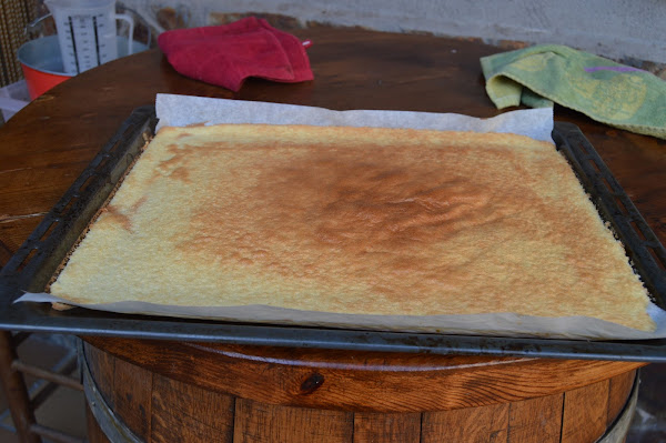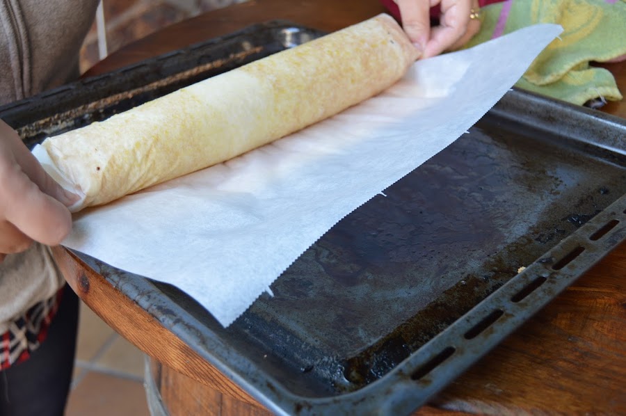 Sin dejar que se enfríe ponemos un papel de horno encima y lo vamos enrollando con delicadeza. Dejamos que se enfríe enrollado, así mantendrá su forma.