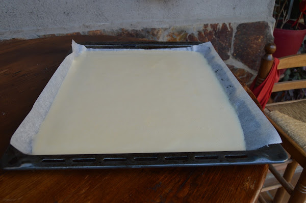 Extendemos papel de horno sobre la bandeja de horno y ponemos toda la masa sobre el papel de horno.