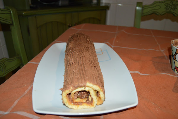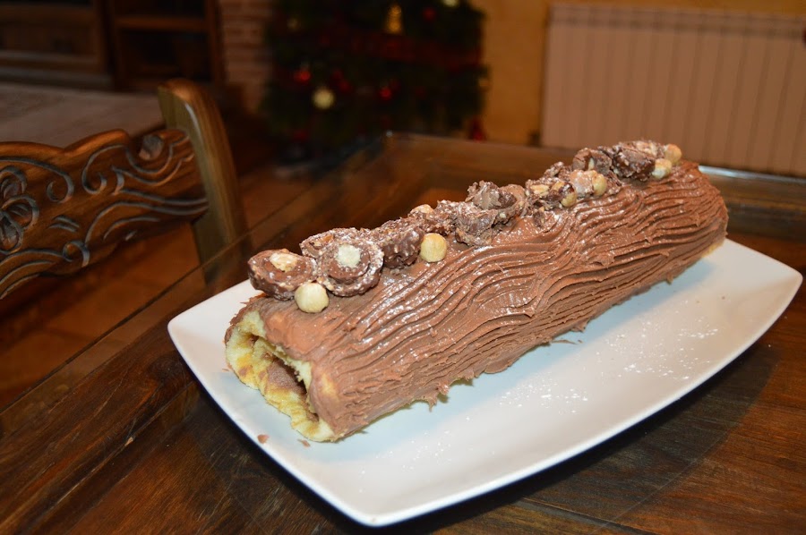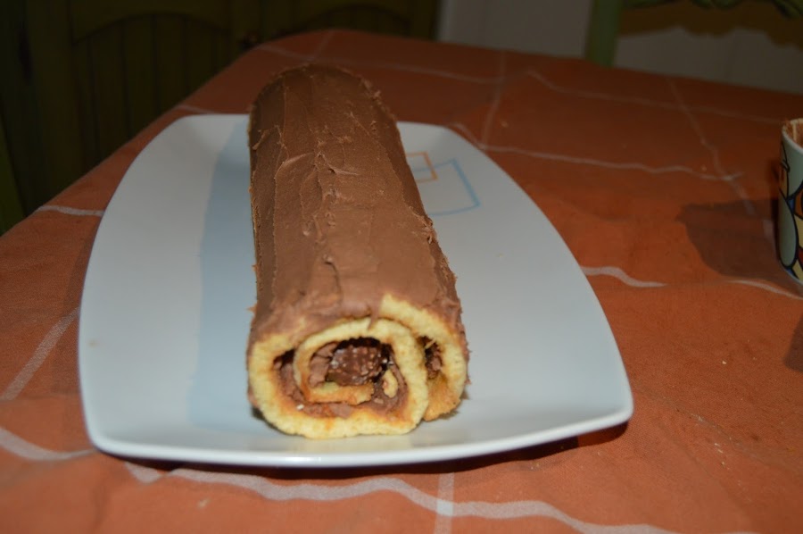Una vez frío el bizcocho, ponemos una fina capa de la crema sobre y le echamos avellanas picadas (opcional) sobre un lateral colocamos una hilera de ferrero rocher y empezamos a enrollar.
