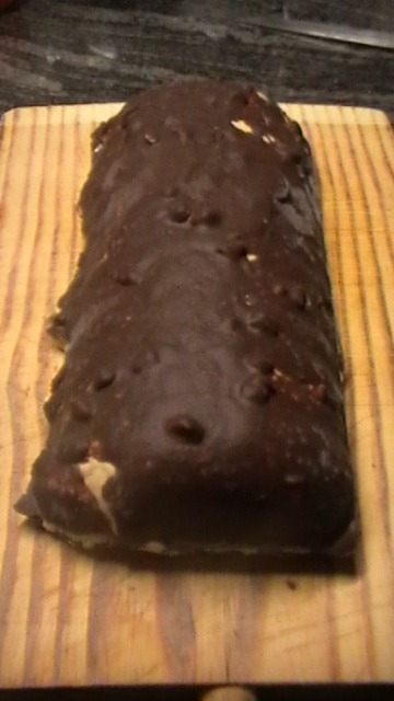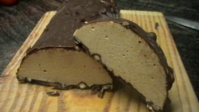 Para ir sobre seguro, al dia siguiente fundimos todo el chocolate y la mantequilla al baño maria, cuando este todo bien incorporado, ponemos la nata (crema de leche), removemos bien, tomamos el helado y en el mismo molde cubrimos con el chocolate fundido, al congelador un par de horas, pasado este tiempo pasamos por el grifo de agua caliente, delmoldamos y cubrimos con el chocolate fundido, que abremos tenido que calentar otra vez, llevamos al congelador, y al dia siguiente podremos cortar y servir..........