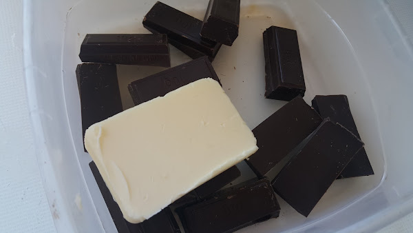 Al día siguiente procedemos a terminar el tronco de navidad. Derretimos el chocolate junto con la mantequilla para preparar la cobertura.