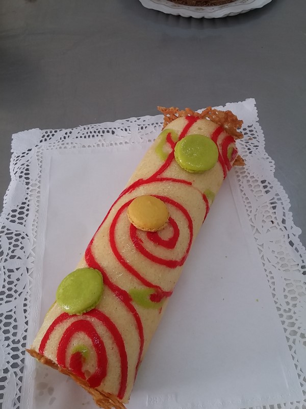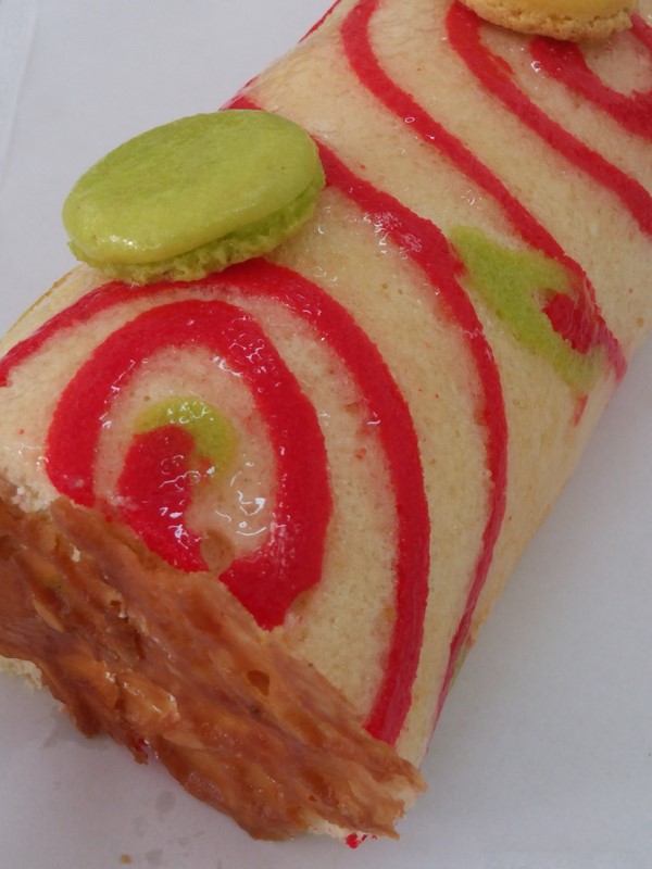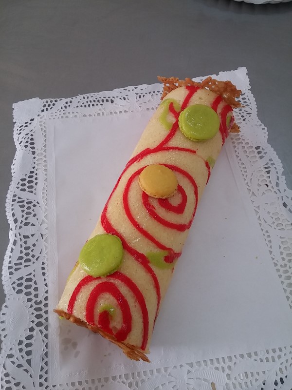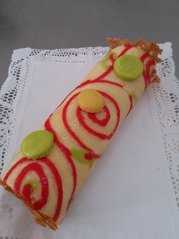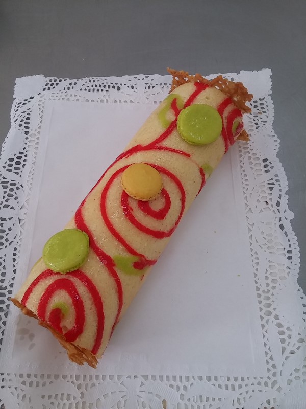 TRONCO SUIZO DECORADO CON CREMA DE QUESO Y FRAMBUESA