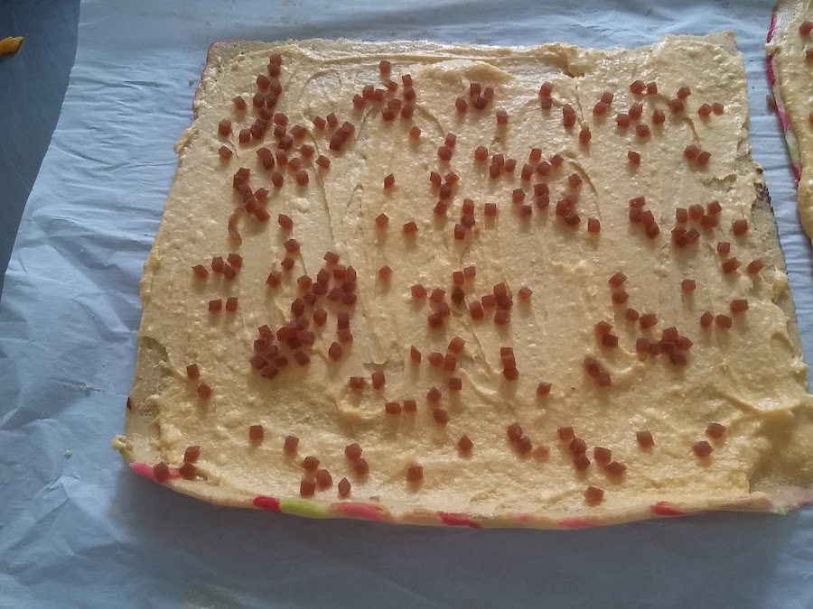 Preparación de la segunda parte del bizcocho Batir los huevos con el azúcar y las dos cucharadas soperas de agua, hasta que blanqueen. Seguidamente agregar la harina poco a poco e integrar con movimientos envolventes. La mezcla obtenida ponerla sobre el dibujo congelado y, sin perder tiempo, hornear a 180-185º C durante 10-15 minutos. Una vez hecho, .enrollar sobre el papel o un paño limpio y dejar reposar unos minutos. Una vez frío, desenrollar con cuidado