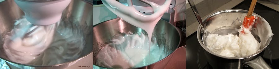 Mezclar los ingredientes en este orden: azúcar, agua y glucosa en un cazo al fuego. Calentar hasta los 114º y retirar del fuego. Verter en el bol de un robot o procesador de cocina y con el accesorio en forma de K, batir a baja velocidad hasta que se enfríe. El líquido inicial se transforma en una pasta blanca que se va endureciendo al enfriar.