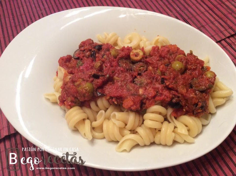 Este fin de semana le tocó a la "puttanesca". Compré una bolsa de trottole, una pasta corta de sémola de trigo duro con forma de peonza, y que me pareció que combinaría bien con la salsa.