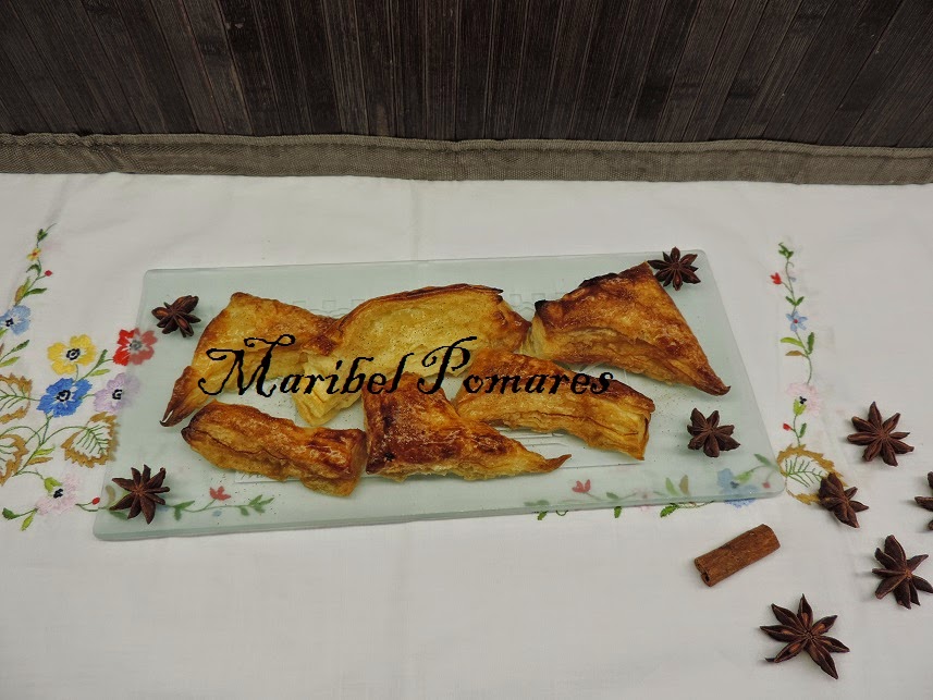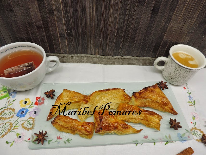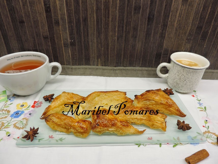 Hemos hecho un dulce para tomar el café o infusión y encima aprovechando los trozos de hojaldre que nos habían quedado.