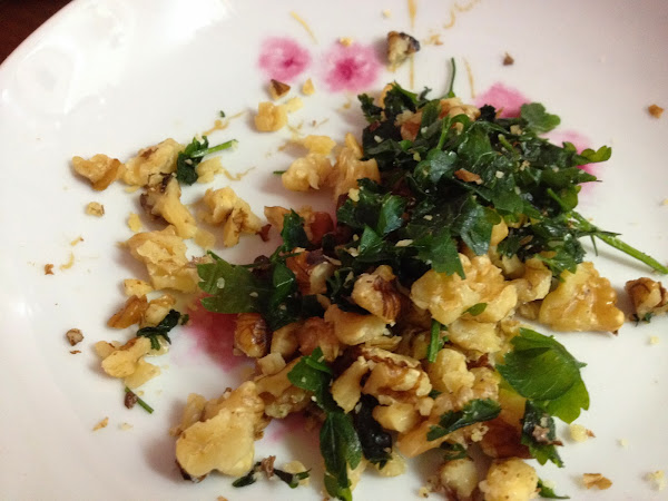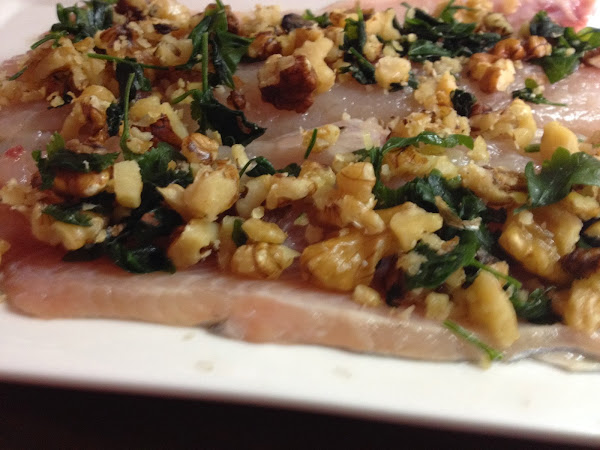 2.- Aplastamos unas nueces, picamos perejil y cilantro. Lo mesclamos todo y cubrimos el pescado.