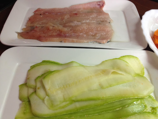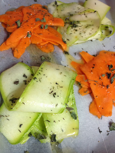 4.- Lavamos el calabacín y la zanahoria. Cortamos el lonchas el calabacín con un pelador de verduras. Pelamos la zanahoria y hacemos lo mismo.