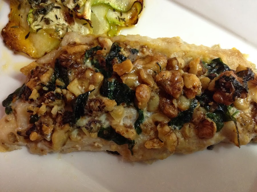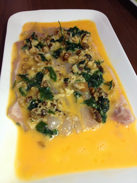 Cubierta con una costra de nueces, perejil, cilantro, salpimentada y bañada por un huevo batido.