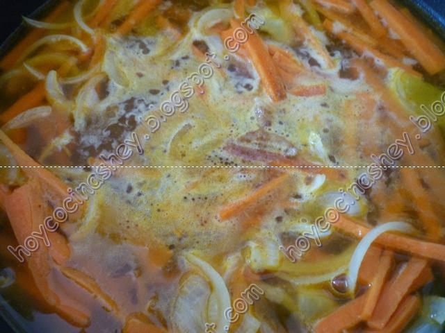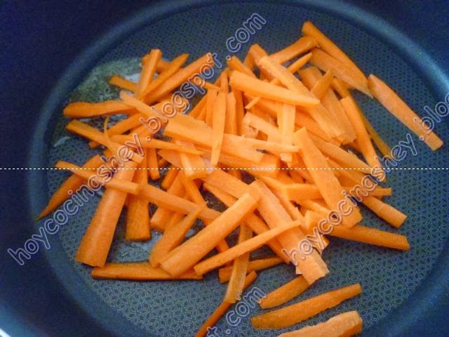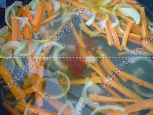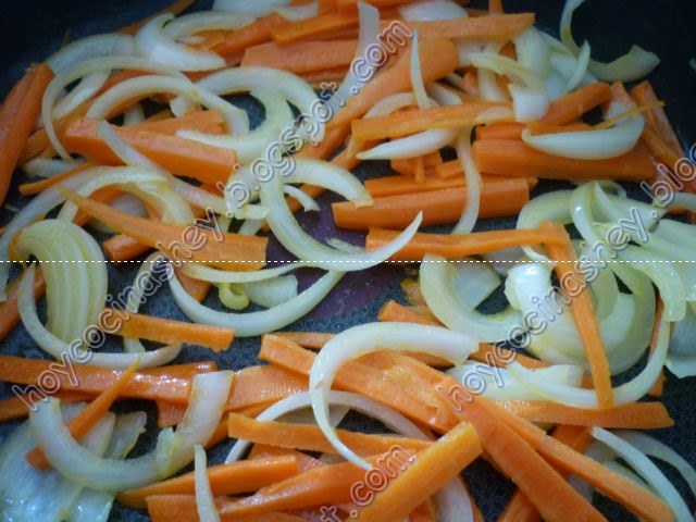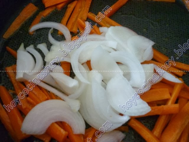 Dejamos que empiecen ablandar un poco y agregamos la cebolla en julianas: