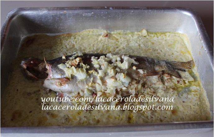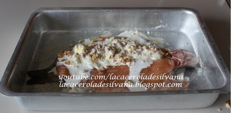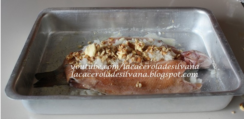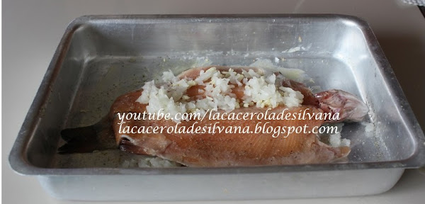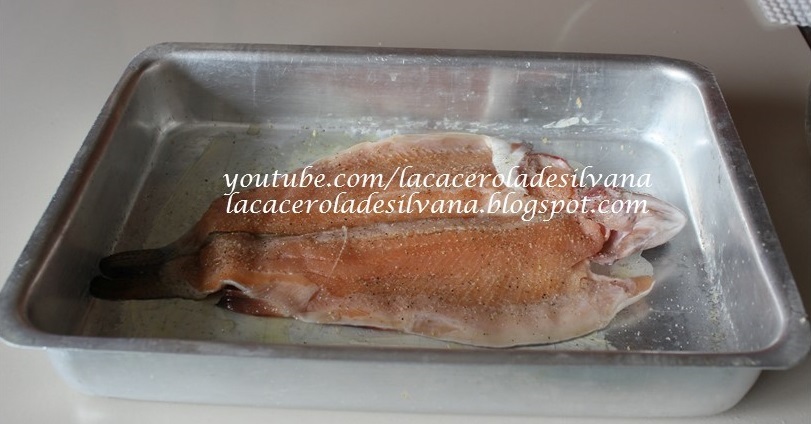 Lavar y condimentar la trucha de ambas caras, luego hacer una cama de cebolla y colocar la trucha encima